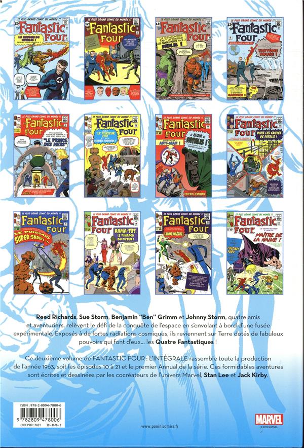 Associé au dessinateur Jack Kirby, Stan Lee revisite l’ancien titre Challengers of the Unknown et crée les Quatre Fantastiques. L’univers Marvel est né. En 1963, la série, devenue le titre préféré des jeunes lecteurs de l’époque et s’améliorant de mois en mois, se poursuit sur la même lignée. Chaque épisode est l’occasion pour Lee et Kirby d’introduire un nouvel et redoutable super-vilain dont les Fantastiques doivent venir à bout. Exception faite de Fatalis, l’ennemi numéro un de l’équipe, déjà bien connu et apprécié des lecteurs et auquel est consacré un récit en deux parties, comme il sied aux vedettes. Dans le même temps, de nouveaux venus font leur apparition : le Fantôme Rouge, le Penseur Fou, l’Homme-Molécule, le Super-Skrull, le Maître de la Haine (dont la véritable identité en ferait frémir plus d’un) et Rama-Tut qui deviendra plus tard Kang le Conquérant découvert dans les pages de la série Avengers. A signaler enfin, l’épopée parue au début du premier annual qui relate le combat du Prince des Mers face à l’humanité tout entière. Ce nouveau volume rassemble toute la production de 1963, autrement dit les épisodes 10 à 21 de la série régulière et le premier annual des Fantastiques. Les couvertures originales et une préface de Stan Lee complètent ce magnifique recueil.