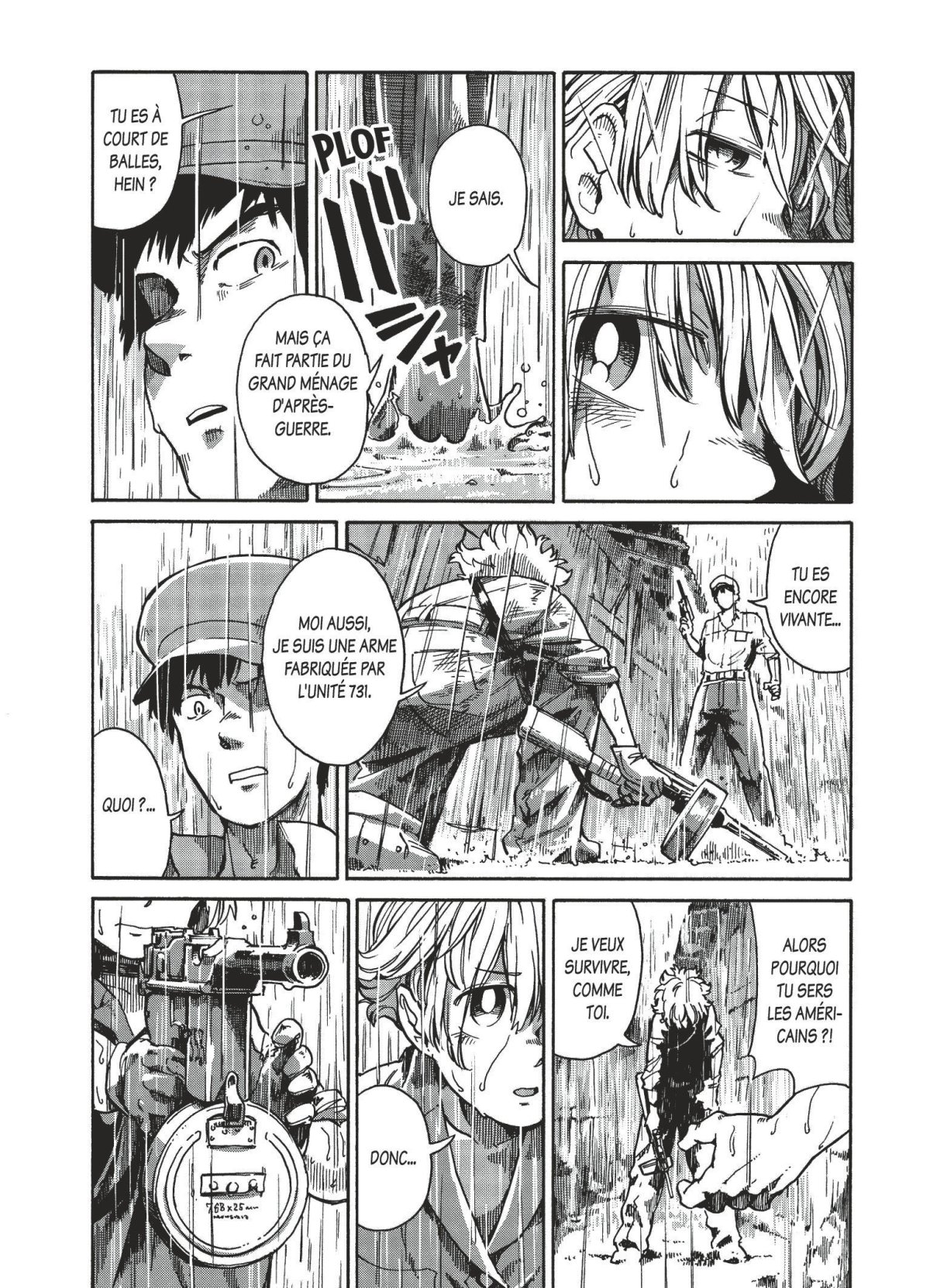 L’Unité 731, créée entre 1932 et 1933 par mandat impérial, était un laboratoire secret, unité militaire de recherche bactériologique de l’Armée impériale japonaise. Officiellement, cette unité, dirigée par Shirō Ishii, se consacrait à « la prévention des épidémies et la purification de l’eau », mais en réalité, elle effectuait des expérimentations sur des cobayes humains. Septembre 1945, Tokyo. Le Japon a capitulé devant les États-Unis. Un processus d’après-guerre est alors initié : la traque et l’élimination systématique des armes humaines créées par l’Unité 731, des combattants génétiquement modifiés, vestiges de la guerre. Dans ce contexte, un soldat démobilisé, Konoe, est recruté et associé avec une jeune fille immortelle, Saika, elle-même née d’une expérience biologique de l’unité 731. Ils devront travailler ensemble pour traquer les créatures hors de contrôle issues de ce laboratoire secret. Septembre 1945, Tokyo. Un processus d’après-guerre est en cours. C’est l’extermination des armes humaines créées par l’Unité 731, vestiges de la guerre qui doivent être éliminés. Une jeune fille immortelle, Saika, déterminée à vivre et à être libre, va aider le soldat Kankuro Konoe, un ancien infirmier militaire. Tous deux se lancent à la recherche des armes humaines dispersées.