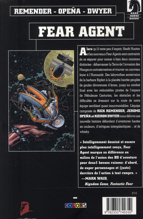 Alors qu’il reste peu d’espoir, Heath Huston et les nouveaux Fear Agents sont contraints de se séparer pour mener à bien deux missions distinctes : débarrasser la terre de l’invasion des mangeurs extraterrestres et trouver un nouveau foyer à l’humanité. Des labyrinthes souterrains de la barbare Kipferi à la planète hantée peuplée de goules dévoreuses d’âmes, jusqu’au combat final avec les redoutables pirates de l’espace de nébuleuse centurion, les obstacles et les difficultés se dressant sur la route de notre équipe semblent quasi insurmontables. l’équipe composée de Rick Remender, Jerome Opena et Kieron Dwyer nous délivre une nouvelle histoire débordant d’aventures hautes en couleurs, d’intrigues intergalactiques. Et de whisky.