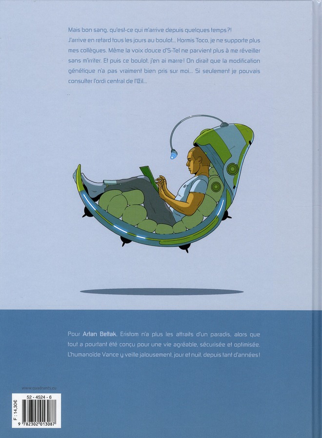 À Eristom, tout est prévu pour une harmonie de vie optimisée pour chaque citoyen. La technologie y a en effet pris le contrôle total sur la nature. La société fonctionne, privée de passé et de l’envie de curiosité, mais elle fonctionne. Pourtant, Artan Beltak, un jeune électricien un peu solitaire, ressent de récurrentes impressions de malaise, comme un désir d’ailleurs qui le ronge. Il se sent différent, sans savoir pourquoi ou comment. Jusqu’au jour où il entrevoit des photos de créatures vivantes, étranges, totalement inconnues...