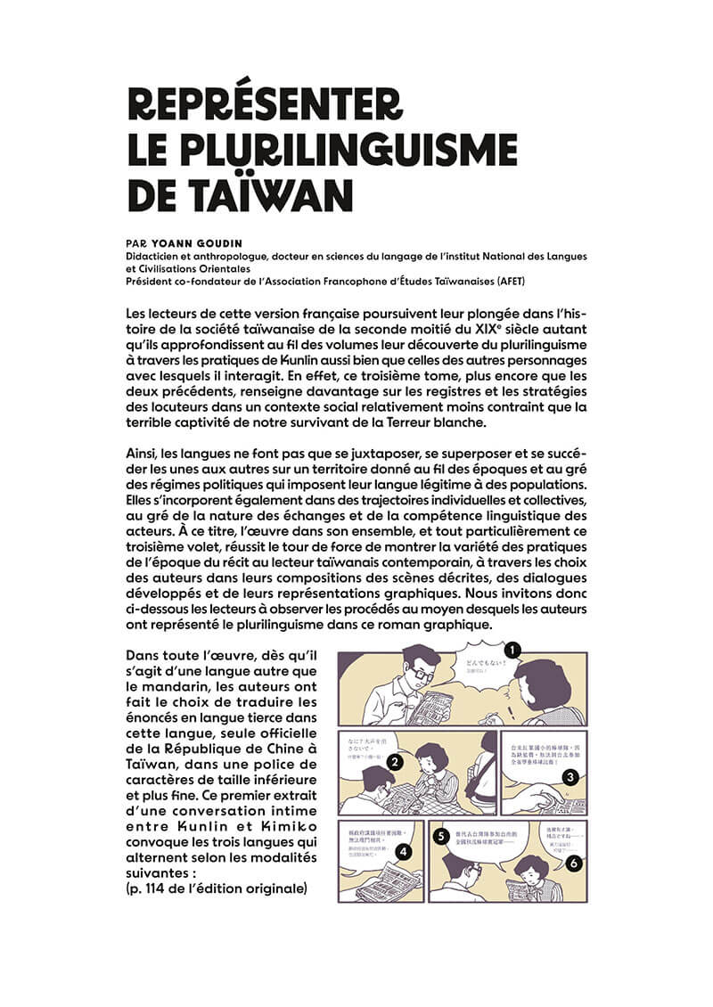 Après sa libération de l’île Verte, Kunlin travaille comme traducteur et éditeur de manhuas, participant à l’essor de la bande dessinée taïwanaise jusqu’à son sommet. En 1966, il crée le magazine de jeunesse Prince afin d’aider les jeunes dessinateurs mis au chômage en raison de la censure qui frappe les bandes dessinées. Le fils de Taïwan est un manhua biographique qui raconte la vie de Kunlin Tsai, acteur de l’ombre derrière la légende de l’équipe espoirs de baseball Hongye, fondateur du magazine Prince et victime d’oppression politique