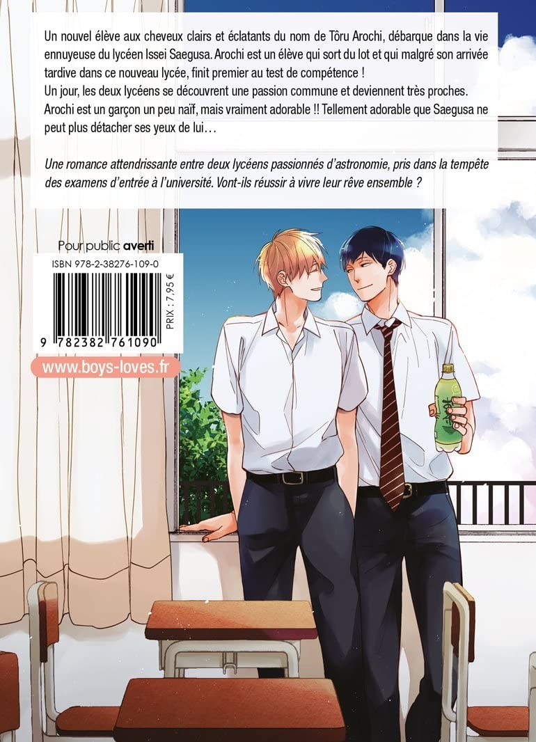 Un nouvel élève aux cheveux clairs et éclatants du nom de Tôru Arochi débarque dans la vie ennuyeuse du lycéen Issei Saegusa. Arochi est un élève qui sort du lot et qui malgré son arrivée tardive dans ce nouveau lycée, finit premier au test de compétences !Un jour, les deux lycéens se découvrent une passion commune et deviennent très proches.Arochi est un garçon un peu naïf mais vraiment adorable !!! Tellement adorable que Saegusa ne peut plus détacher ses yeux de lui...Une romance attendrissante entre deux lycéens passionnés d’astronomie, pris dans la tempête des examens d’entrée à l’université. Vont-ils réussir à vivre leur rêve ensemble ?Une romance attendrissante entre deux lycéens passionnés d’astronomie, pris dans la tempête des examens d’entrée à l’université. Vont-ils réussir à vivre leur rêve ensemble ?