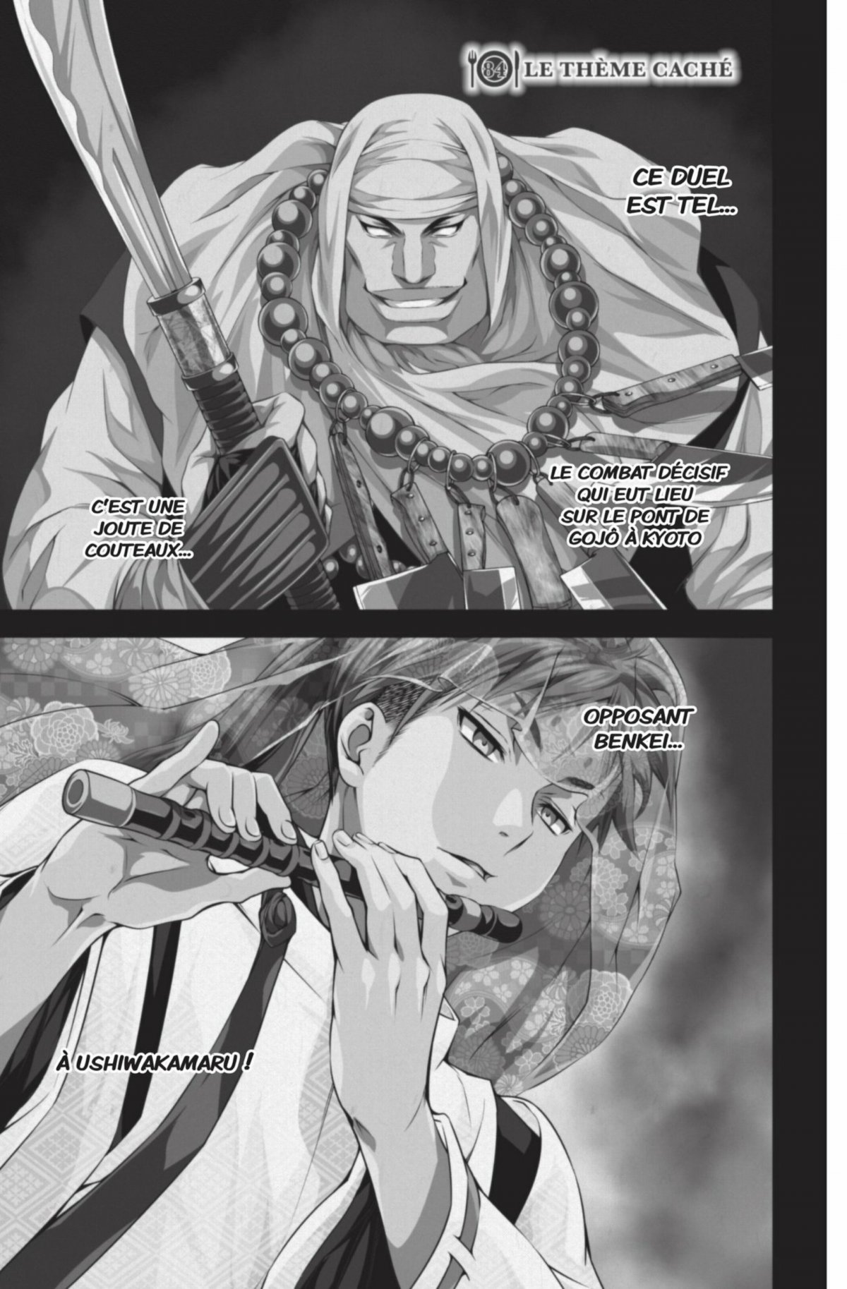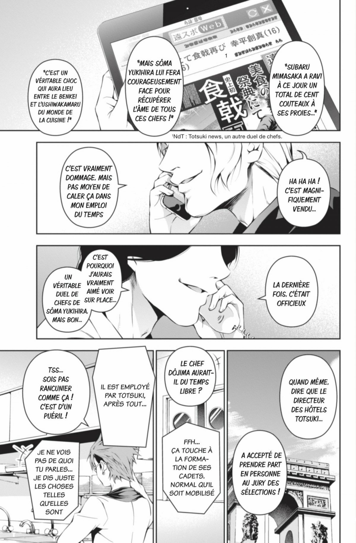 Subaru, qui ne cuisine que dans le but de vaincre ses adversaires, n’he site pas a traquer obstine ment chacune de ses proies pour les copier a la perfection. So ma, lui, s’interroge sur le ve ritable sens de la cuisine. Pour trouver les re ponses a ses questions, il de cide de mettre sa carrie re de chef en jeu face a Subaru ! L’heure du verdict est proche pour ce premier duel des demi-finales !