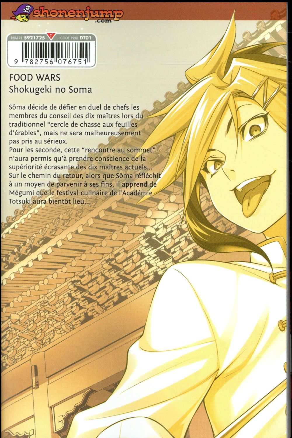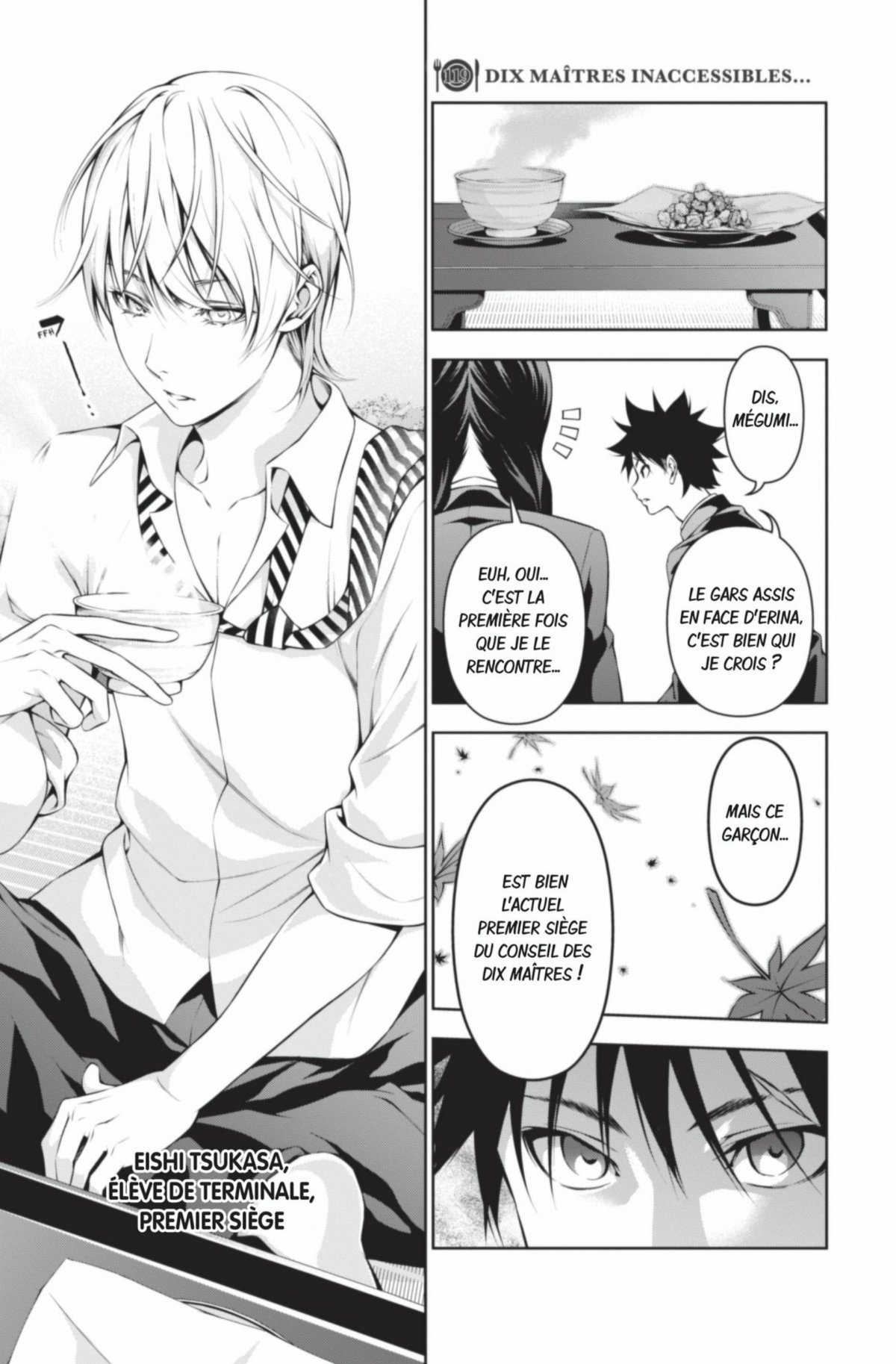 Sôma décide de défier en duel de chefs les membres du conseil des dix maîtres lors du traditionnel cercle de chasse aux feuilles d’érables, mais ne sera malheureusement pas pris au sérieux. Pour les seconde, cette rencontre au sommet n’aura permis qu’a prendre conscience de la supériorité écrasante des dix maîtres actuels... Sur le chemin du retour, alors que Sôma réfléchit à un moyen de parvenir à ses fins, il apprend de Mégumi que le festival culinaire de l’Académie Totsuki aura bientôt lieu...
