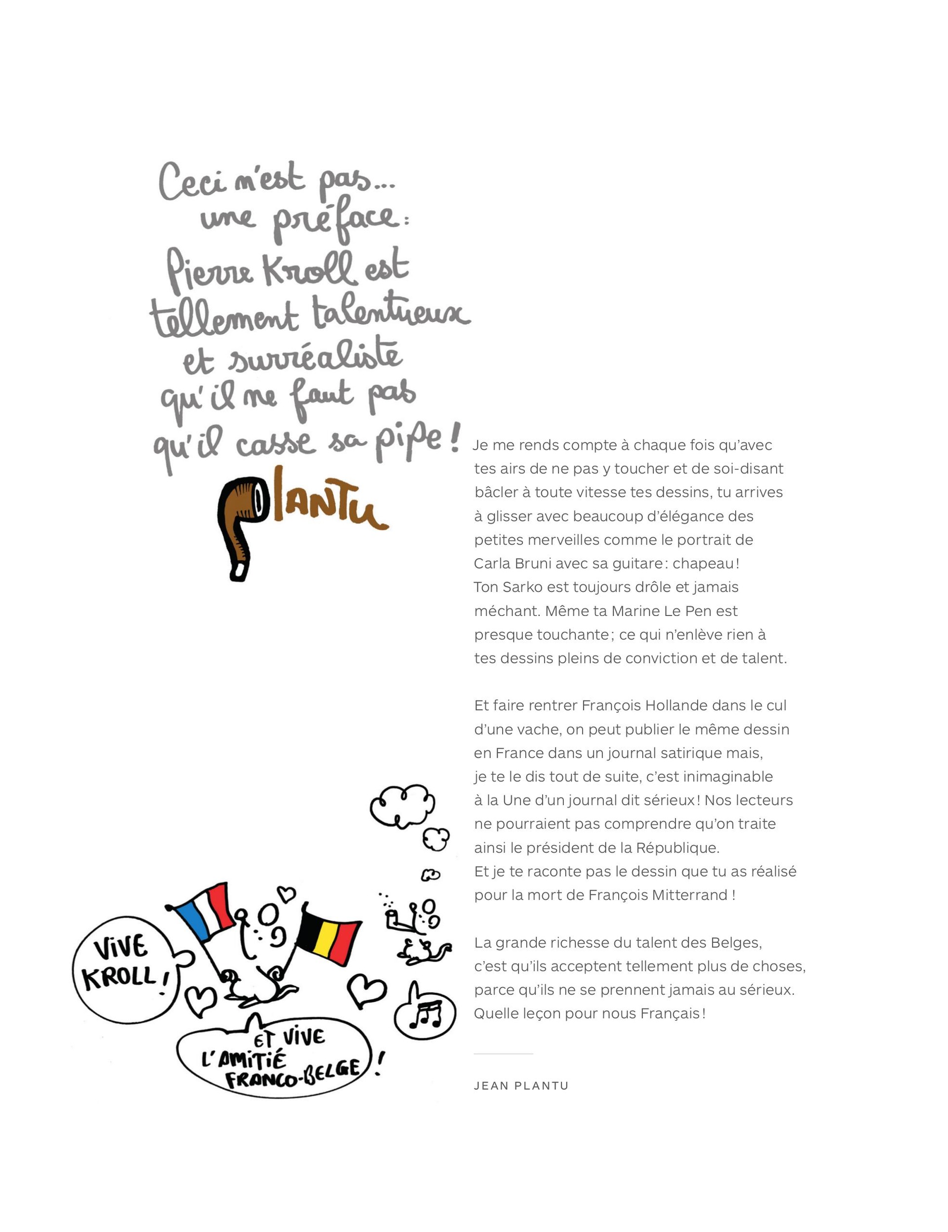 Fin observateur de la France depuis plus de vingt ans, Pierre Kroll saisit avec justesse nos imperfections, nos suffisances, nos défauts, nos qualités, nos présidents, nos grèves, nos longs débats autocentré... avec humour, finesse et beaucoup de tendresse. Un regard critique mais toujours bienveillant. Kroll est un artiste complet, caricaturiste attitré du quotidien belge Le Soir et de l’hebdomadaire CinéTéléRevue, il est aussi chroniqueur radio et dessine en direct à la télévision tous les dimanches sur la RTBF. Il est le premier dessinateur de presse à se produire seul sur scène pour raconter son parcours particulier et sa vision du monde.