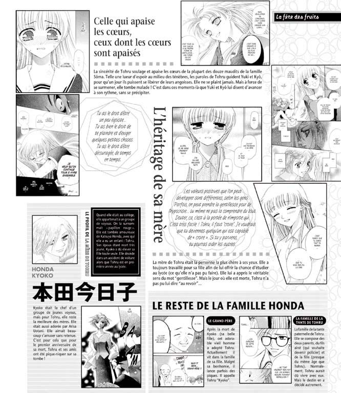 Ce livre est un must pour ceux qui veulent en savoir plus sur les héros de Fruits Basket. Chaque personnage fait l’objet d’une fiche d’information détaillée et d’une analyse fine, le tout sur un ton toujours détendu et enjoué. De magnifiques illustrations en couleur et un catalogue de goodies japonais inédits en France complètent impeccablement cet ouvrage.