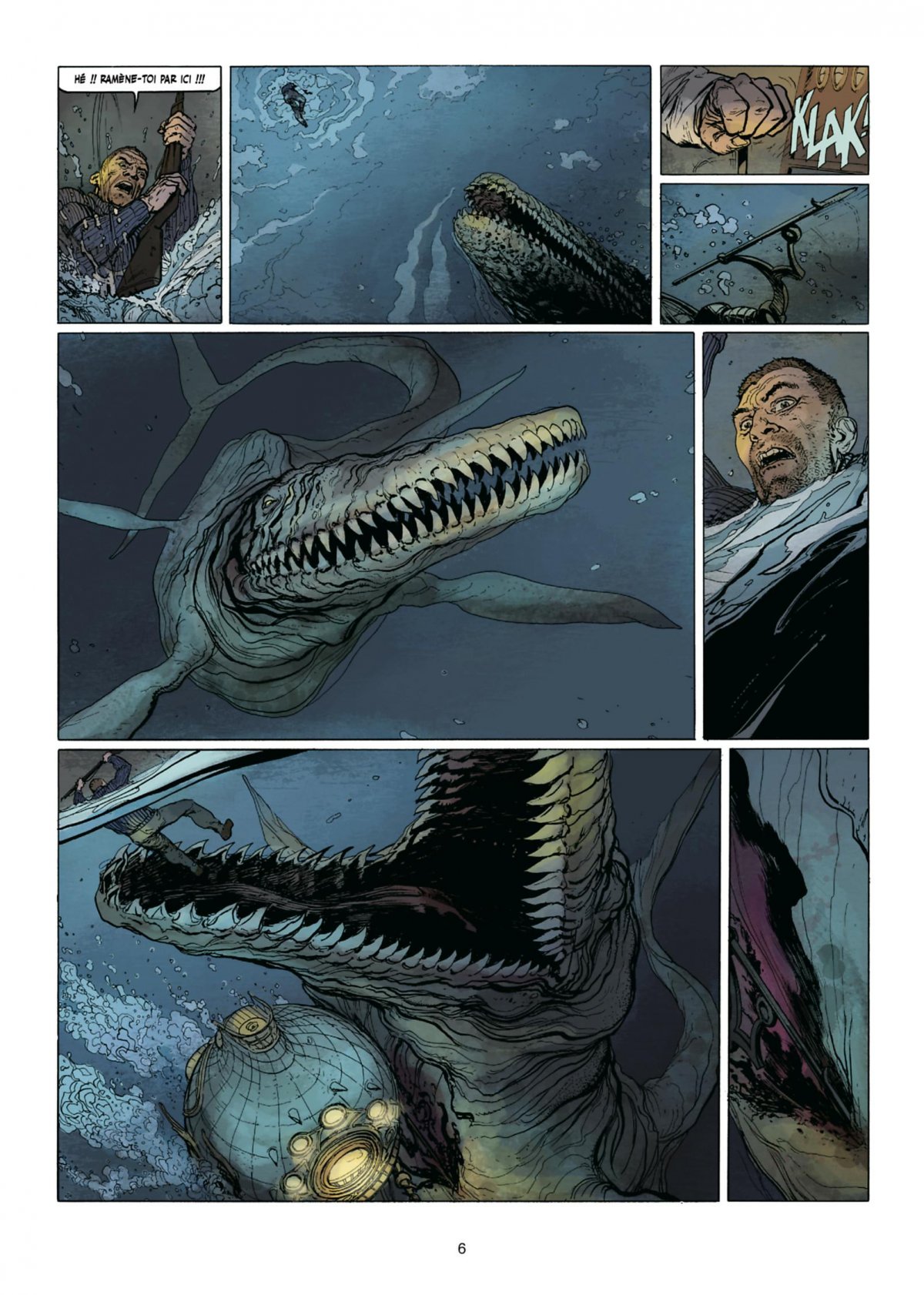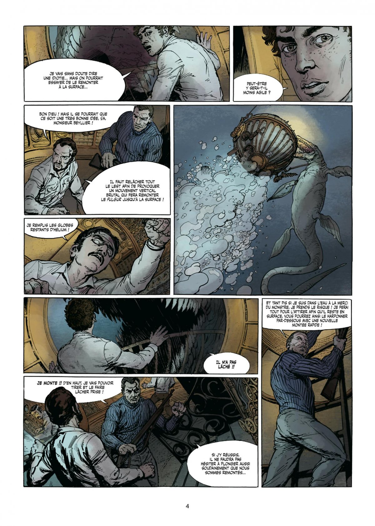 La quête du trésor tourne court et l’aventure prend une dimension épique. De Jules Verne, nous passons à Arthur Conan Doyle et son Monde Perdu. Bec, aux manettes du submersible révolutionnaire, semble plus inspiré que jamais ! Le Fulgur parvient tant bien que mal à échapper à l’énorme mosasaure, et poursuit son exploration de cette mer préhistorique défiant les lois de l’entendement. L’entêtement de Kens à rechercher le profit et la morosité ambiante, à force de subir cet enfermement forcé, mettent l’équipe sur les nerfs. Les explorateurs découvrent, dans l’immense caverne, une excroissance de terre à explorer. Serait-ce un infime espoir de sortie ?