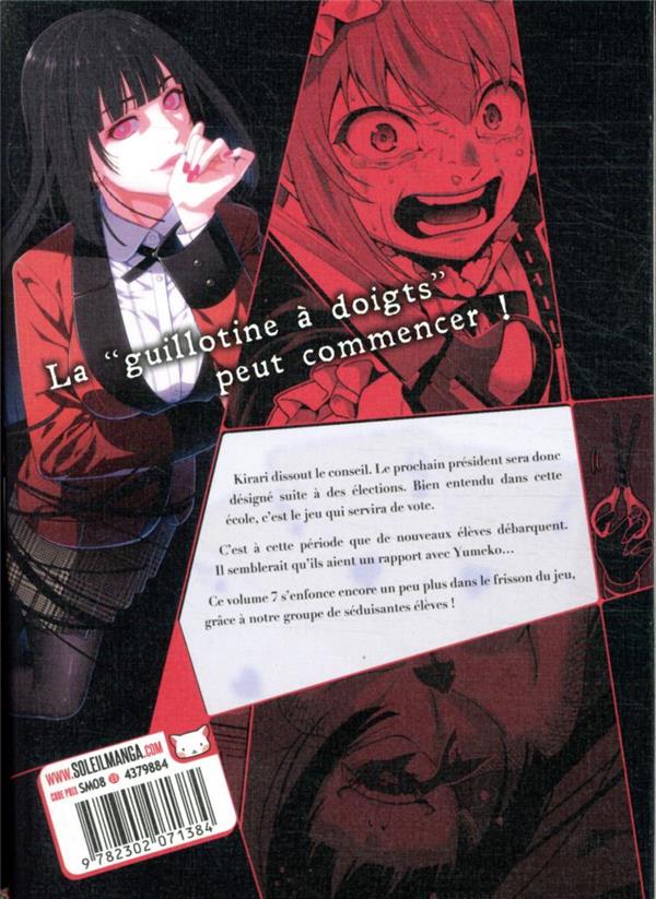 La « guillotine à doigts » peut commencer ! Kirari dissout le conseil. Le prochain président sera donc désigné suite à des élections. Bien entendu dans cette école, c’est le jeu qui servira de vote. C’est à cette période que de nouveaux élèves débarquent. Il semblerait qu’ils aient un rapport avec Yumeko. Ce volume 7 s’enfonce encore un peu plus dans le frisson du jeu, grâce à notre groupe de séduisants élèves !