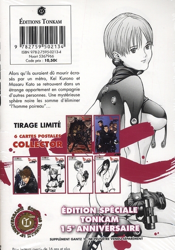 Gantz 1 est le volume 1 de la série Gantz par Hiroya Oku, paru en 2002. Selon nos informations, il en existe 2 éditions, dont la principale est éditée par Tonkam en 2002.