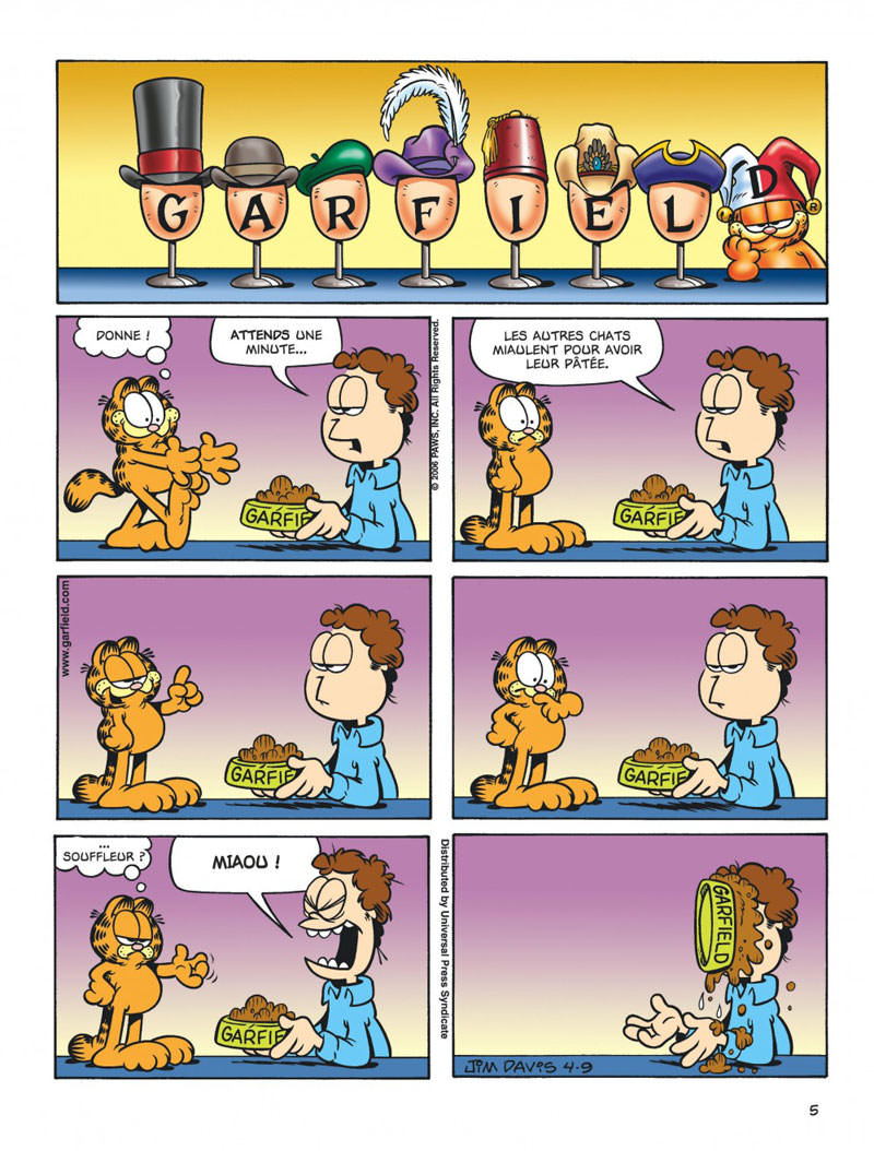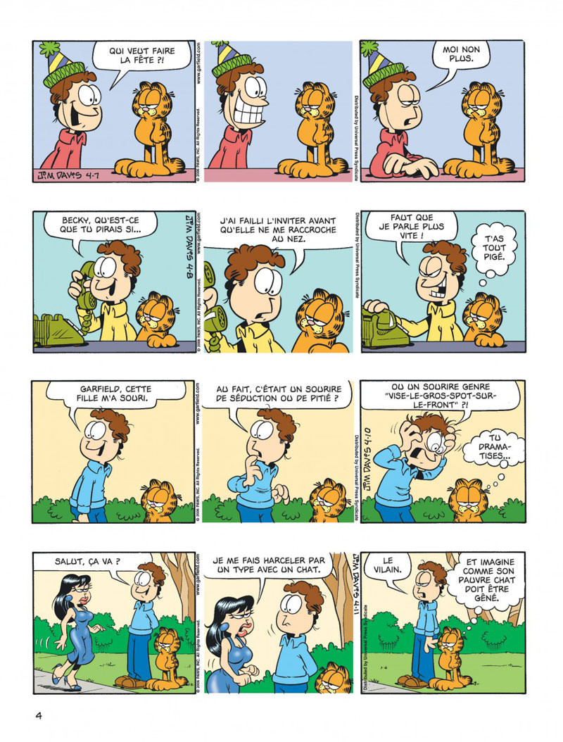 Attention, album poilant ! La couverture très spéciale de cet album en fera le plus chéri et caressé de la série. Cela dit, les activités préférées de Garfield se comptent toujours au nombre de quatre : manger, manger, manger et assister au spectacle navrant de son maître, Jon, tentant d’obtenir un rendez-vous avec une femme. Et si Jon a beaucoup de défauts, on ne peut lui enlever cette immense qualité : il est très tenace et ne désespère jamais bien qu’il se prenne râteau sur râteau... Cela pour la plus grande joie de Garfield. Mais notre chat préféré ne se laisse pas détourner bien longtemps de son occupation favorite, faut-il encore le rappeler : manger !