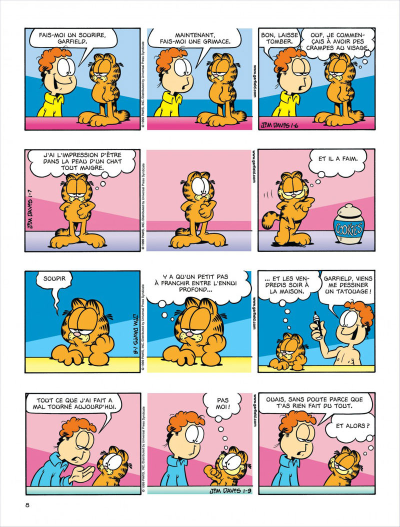 Quand Garfield arbore un large sourire de bonne humeur, c’est le moment de gagner les abris : il va faire une bêtise mais il ne sait pas encore laquelle. Mais parfois, il sombre dans la mélancolie : il a l’impression d’être dans la peau d’un chat tout maigre. Donc, d’un chat qui a faim.