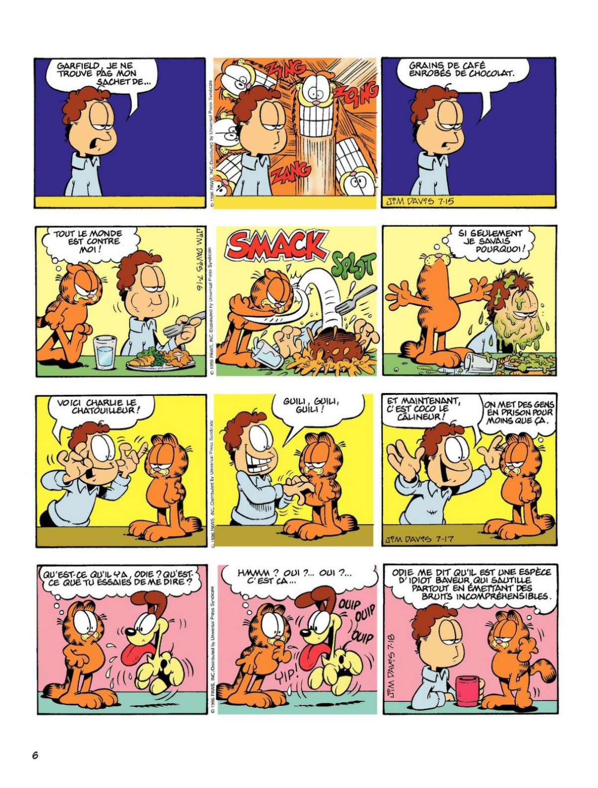 Côté états d’âme, la vie de Garfield est une lutte perpétuelle entre le bien et le mal : doit-il virer Odie d’un coup de pied, ou d’un petit coup de coude accidentel ? Et il se sent coupable d’avoir bouffé toute la boîte de beignets : c’étaient ses amis. Pour le reste, tout va bien : Jon travaille et il ne fait rien, ça nous donne un équilibre impeccable entre le yin et le yang.