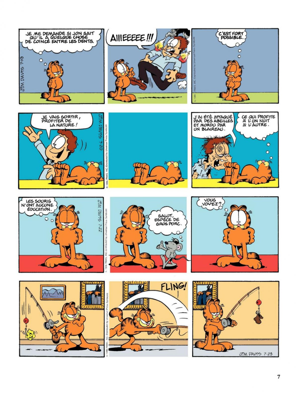 A part ça, il déteste toujours le lundi. C’est le jour où il se ramasse la figure sur les ballons, où Jon l’écrabouille entre la porte et le mur, où il rigole tellement qu’il avale une guêpe. Ce jour-là, pour se sentir d’attaque, Garfield a besoin de serrer deux fois son ours dans ses bras.