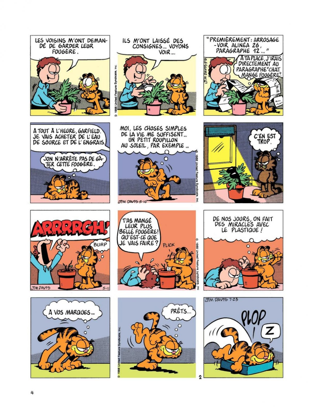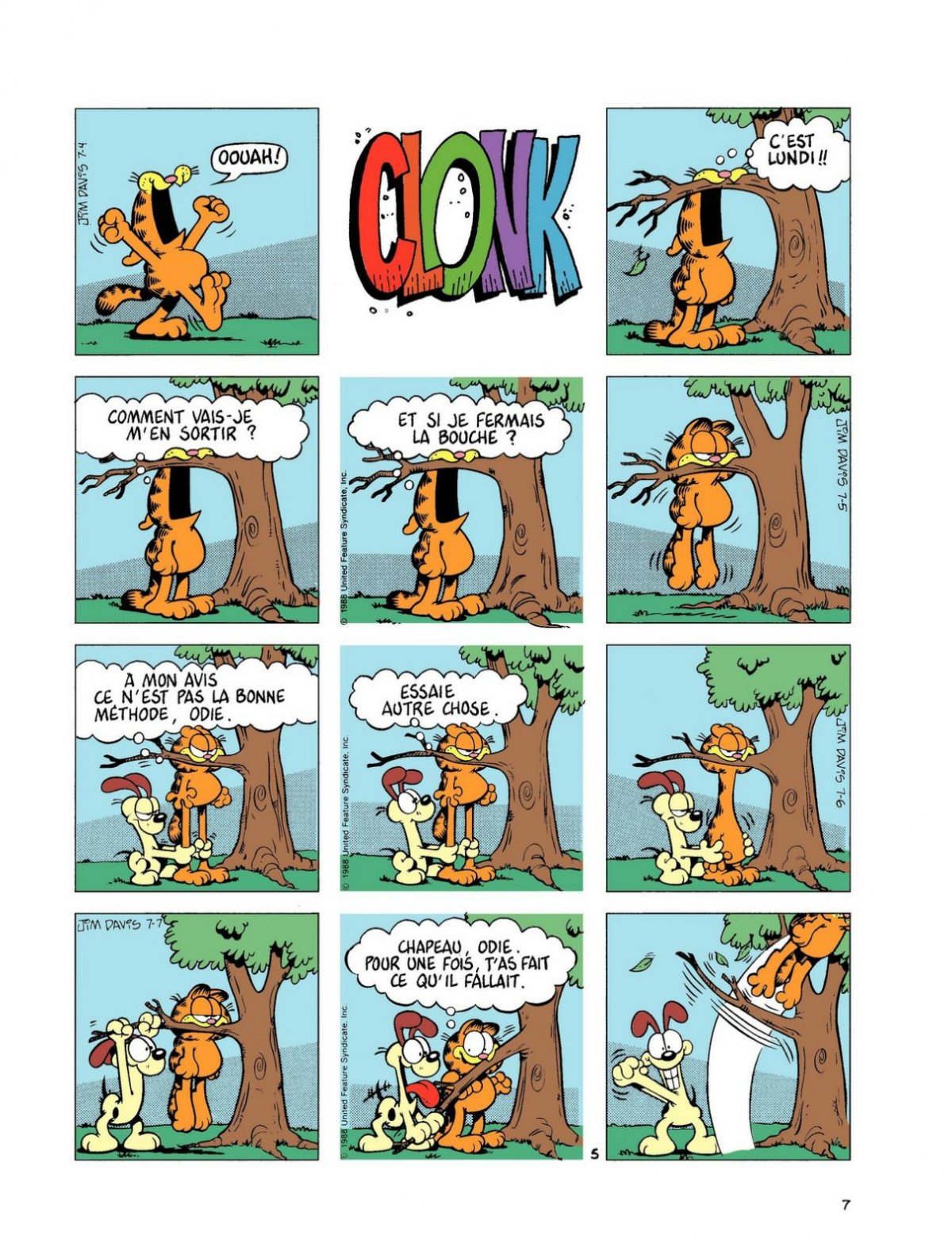 A la lecture de ce 14ème album, aucun doute n’est plus permis : Garfield est un goinfre qui dort beaucoup, ou un feignant qui s’empiffre. Il aime la paresse parce qu’elle "demande peu d’efforts" et il préfère les spaghettis noués bout à bout parce que c’est meilleur "quand ça se mange d’un trait". S’il arrête de manger pendant trois cases (ou de rêver qu’il mange), c’est parce qu’il s’est coincé la mâchoire en bâillant, ou parce qu’il est occupé à disserter sur la qualité de son sommeil. De temps en temps, il joue au volley-chien avec Odie dans le rôle du ballon - ce brave Odie, incarnation obstinée de la joie de vivre et de la parfaite innocence. Et puis il retourne manger une fougère ou une cuisse de facteur. Et à quoi reconnaît-on Garfield sur la photo, perdu au milieu d’un troupeau de cochons ? C’est celui qui est rayé... En passant, Jim Davis nous gratifie d’un excellent modèle de régime, à faire pâlir les magazines féminins : le fameux régime Raymond. Au moindre écart, un type qui s’appelle Raymond vient vous coller une paire de baffes !