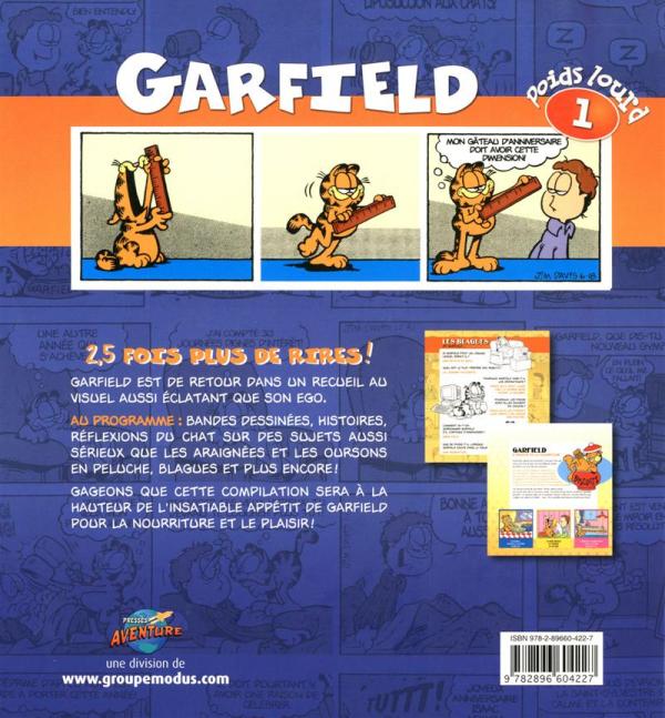 Garfield poids lourd 1 est le volume 1 de la série Garfield poids lourd par Jim Davis, paru en 2001. Selon nos informations, il en existe 2 éditions, dont la principale est éditée par Presses Aventure en 2001.