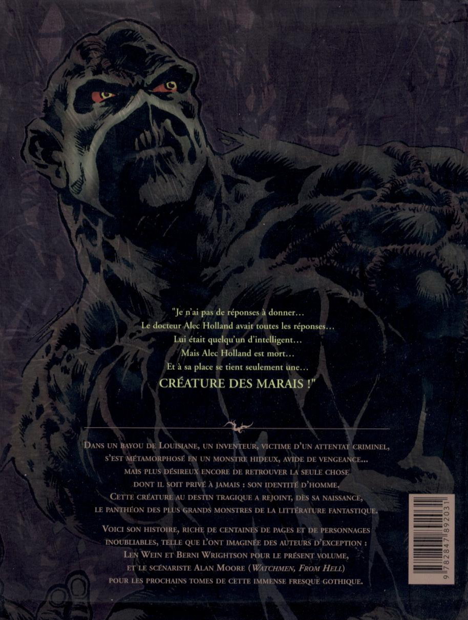 Dans un bayou de Louisiane, un inventeur, victime d’un attentat criminel, s’est métamorphosé en un monstre hideux, avide de vengeance. Mais plus désireux encore de retrouver la seule chose dont il soit privé à jamais : son identité d’homme. Cette créature au destin tragique a rejoint, dès sa naissance, le panthéon des plus grands monstres de la littérature fantastique. Voici son histoire, riche de centaines de pages et de personnages inoubliables, telle que l’ont imaginée des auteurs d’exception Len Wein et Berni Wrightson pour le présent volume, et le scénariste Alan Moore pour les prochains tomes de cette immense fresque gothique.