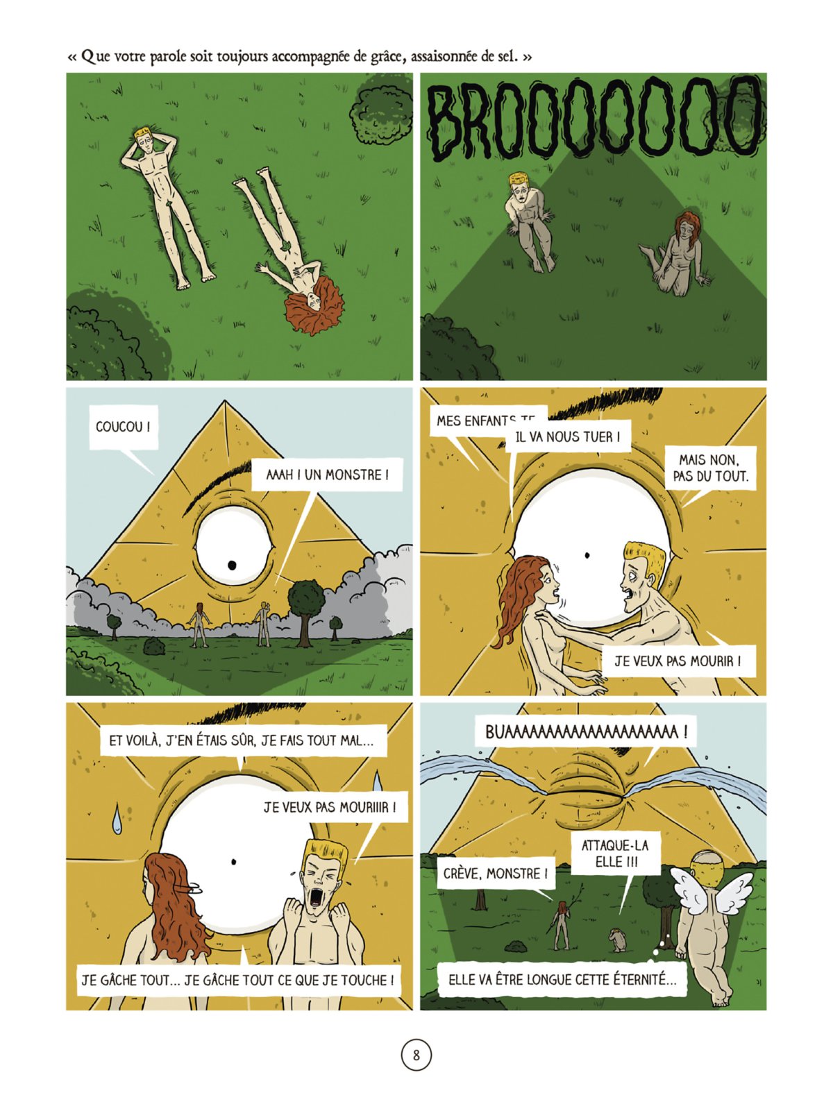 Genèse et Prozac offre une réinterprétation de la Bible et du nouveau testament concentrée sur la gêne, les faux pas, la maladresse ou le travail bâclé. Car si l’erreur est humaine, elle a commencé par être divine