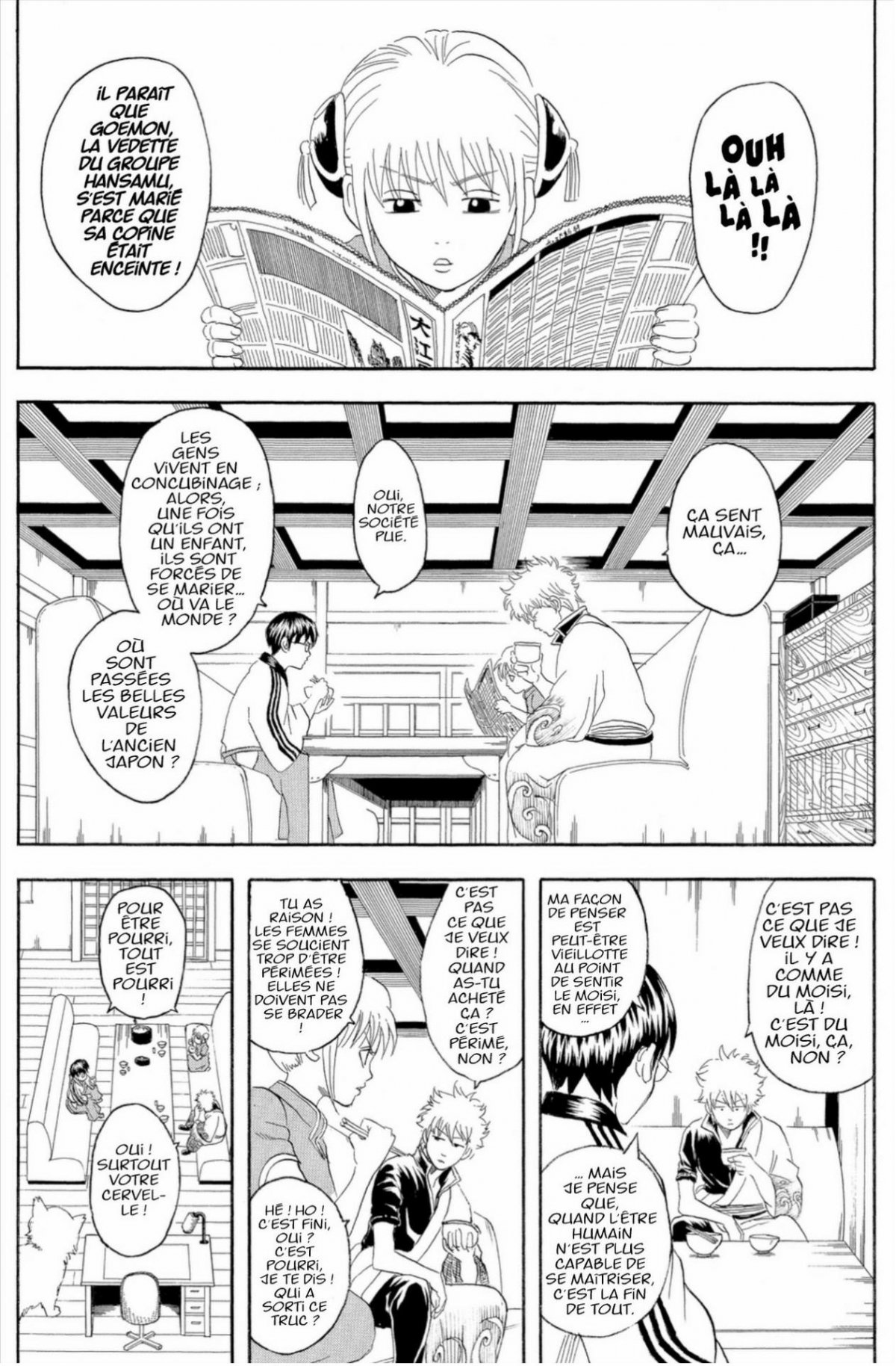 Gin a un fils caché !? Une belle pagaille va suivre l’arrivée de Gintoki Junior, qui a été abandonné devant la maison de l’homme à tout faire. Dans ce volume, Gin va également risquer sa vie pour trouver un ventilateur, il va effrayer ses concitoyens pour tester leur courage, et enfin partir à la chasse au scarabée avec le Shinsengumi. Que d’aventures pour notrehomme à tout faire et ses partenaires !!