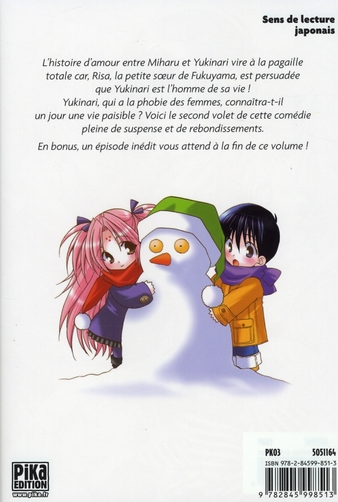 L’histoire d’amour entre Miharu et Yukinari vire à la pagaille totale car, Risa, la petite soeur de Fukuyama, est persuadée que Yukinari est l’homme de sa vie ! Yukinari, qui a la phobie des femmes, connaîtra-t-il un jour une vie paisible ? Voici le second volet de cette comédie pleine de suspense et de rebondissements. En bonus, un épisode inédit vous attend ô la fin de ce volume !