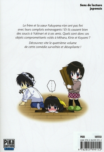 Le frère et la soeur Fukuyama n’en ont pas fini avec leurs complots extravagants. Et ils causent bien des soucis à Yukinari et ses amis. Quels sont donc ces objets compromettants volés à Miharu, Kirie et Koyomi ? Découvrez vite le quatrième volume de cette comédie.