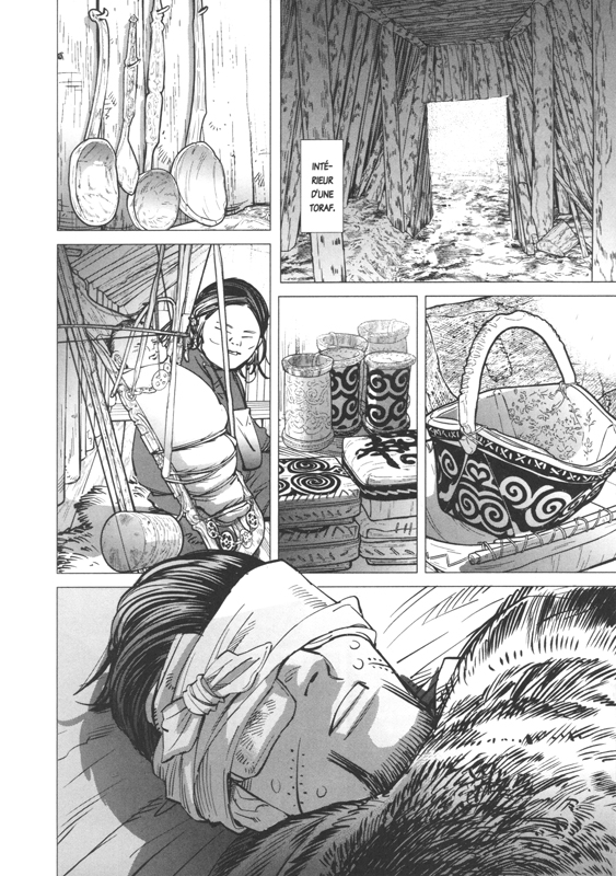 L’évasion de Sofia a été couronnée de succès... Le caporal Ogata profite de la confusion pour prendre Ashirpa à part et tenter de lui extorquer le secret menant au trésor des Aïnous. Heureusement, Sugimoto arrive à temps pour éviter le pire ! En pleine tempête de neige, poursuivants et poursuivis se rejoignent enfin, pour des retrouvailles explosives... Et pour cause, les hommes du lieutenant Tsurumi font face à Kiroranke ; le combat est sanglant, mais à un contre trois l’artificier finit par être abattu, laissant le doute planer sur ses actes. Sakhaline n’offre plus rien pour nos héros... Il est temps de rentrer à Hokkaido !