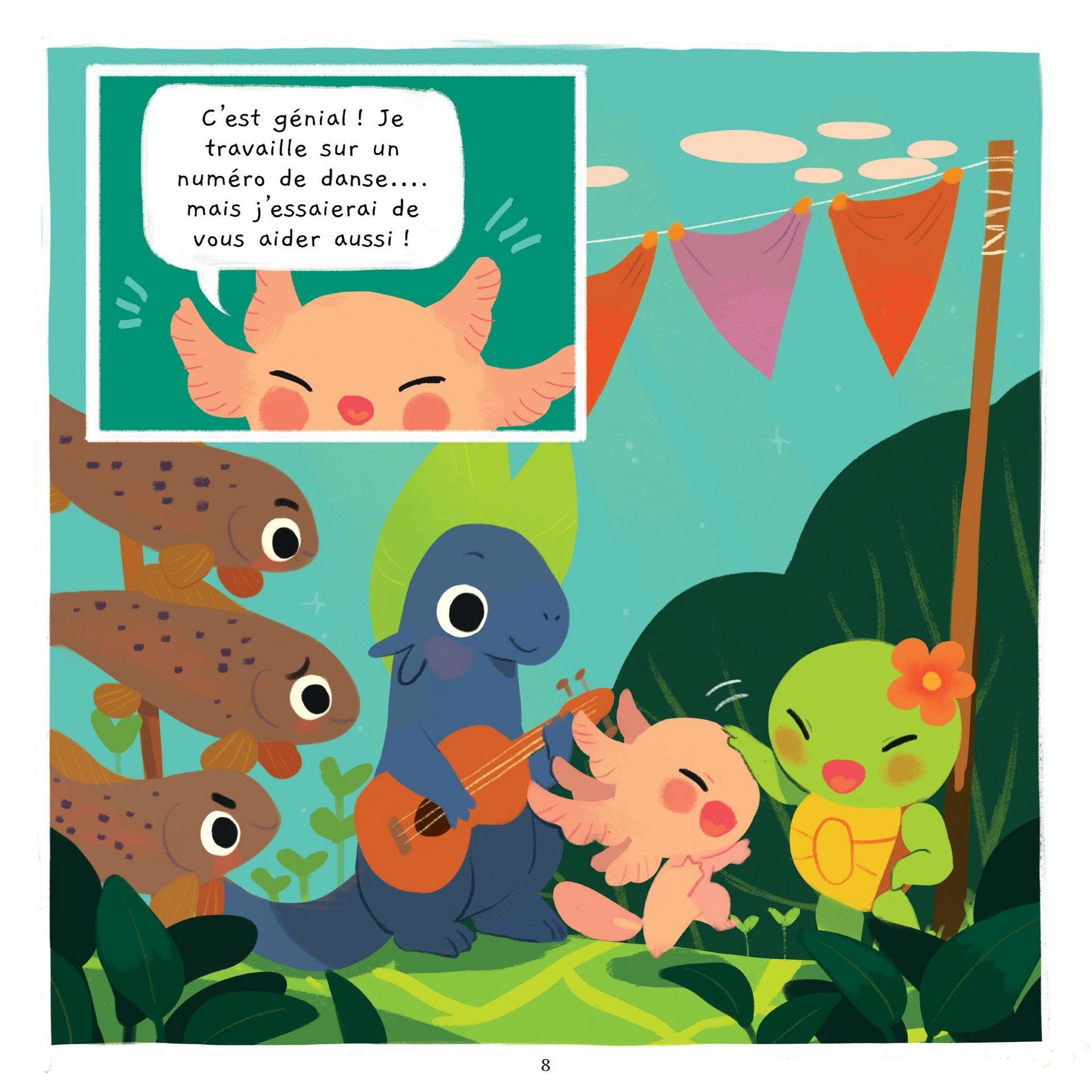 Gouttelette l’axolotl a hâte d’encourager tous ses amis. Mais alors que le grand jour approche, ses amis deviennent de plus en plus nerveux… Gouttelette arrivera-t-il à leur rappeler que le plus important est de faire de leur mieux ?