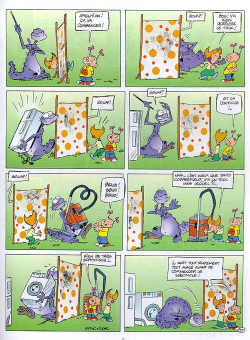 Inventif et serviable, cet amour de dinosaurien s’efforce de faire le bonheur de son entourage. Mais d’une maladresse déconcertante, il accumule hélas gaffe sur gaffe. Doté d’un appétit colossal, il ingurgite aussi tout et n’importe quoi au grand désarroi de sa famille d’accueil. Pourtant, les enfants l’adorent ! Pour la délurée petite Géraldine et son malicieux copain Jérôme, cette grosse bébète affectueuse et d’un optimisme communicatif est le compagnon de jeux rêvé et le complice idéal de bien des espiègleries.