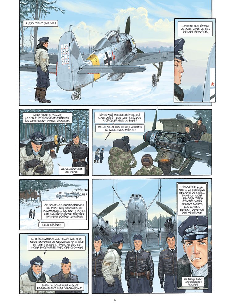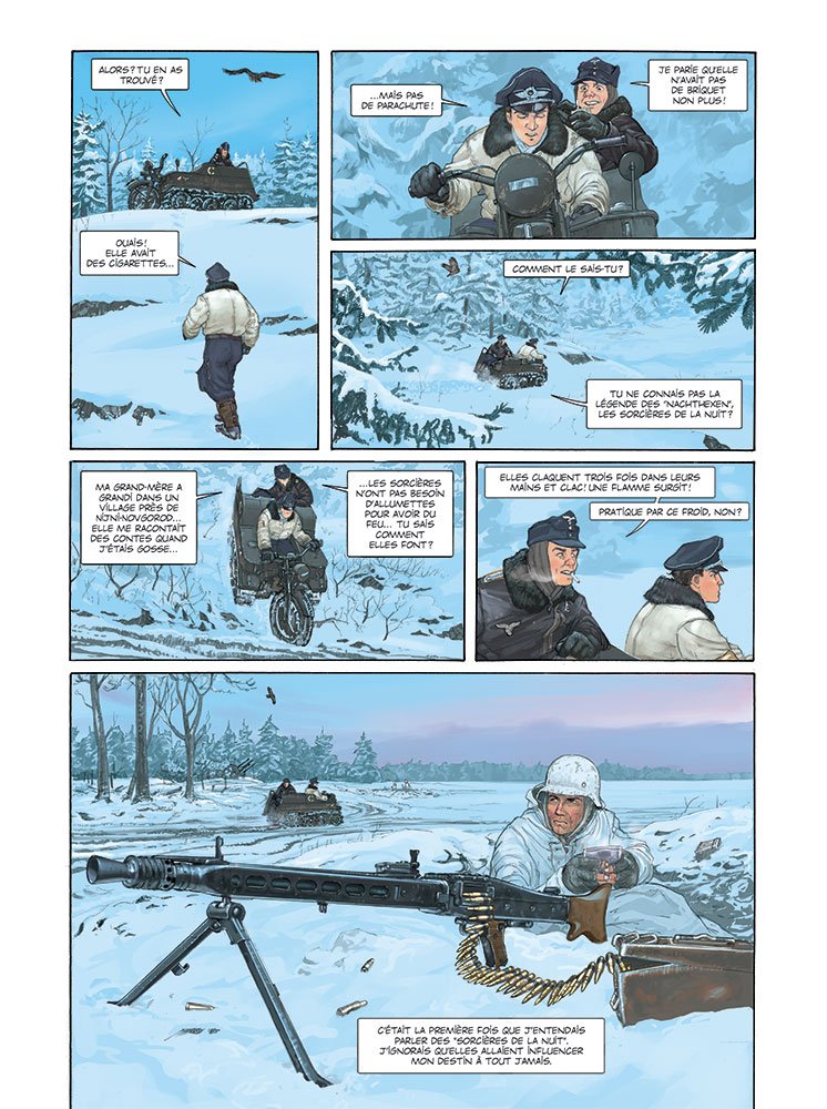 Wülf , un jeune "AS" de la Luftwaffe, lutte contre l’aviation soviétique dans la chasse de nuit. Horrifié par la barbarie nazie, il a refusé d’orner son zinc d’une croix gammée.... s’attirant l’inimitié de certains pilotes plus fanatisés. Wülf est d’autant plus écoeuré qu’il doit combattre de jeunes femmes pilotes russes, qui vont au casse-pipe sur des biplans démodés, sans emporter de parachute. La seule personne qui donne encore un sens à son existence c’est Romy, sa fillette et peut-être aussi son grand duc apprivoisé... Jusqu’à ce que son destin croise dans le ciel celui de Lilya, une des célèbres "Sorcières de la Nuit" !