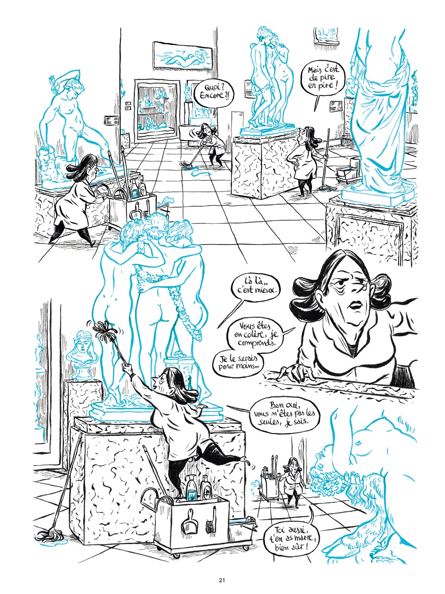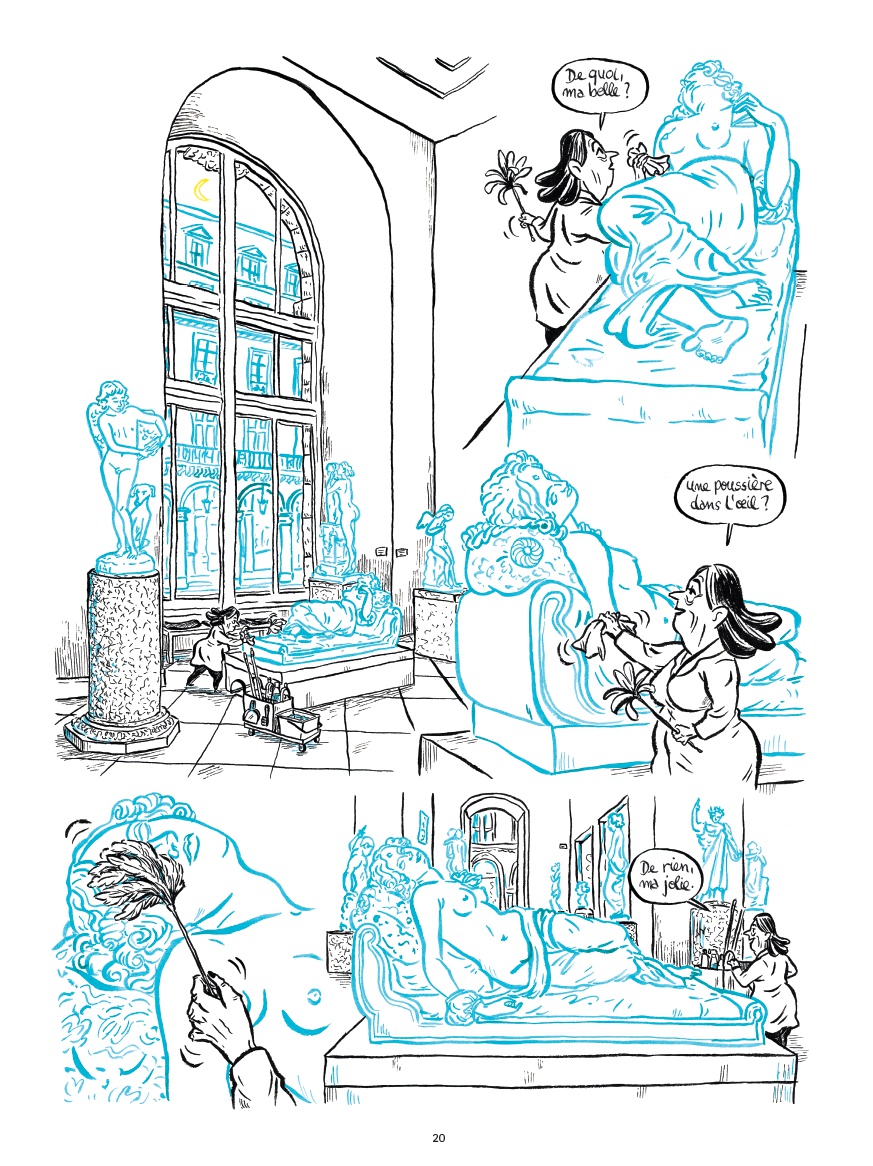 Un conte « fantasticomique », qui porte un regard critique sur la sexualisation du corps féminin et, en particulier, de la nudité féminine à travers l’histoire de l’art. Récit à la fois drôle et léger sur la place de la femme dans notre société, le harcèlement de rue et le traumatisme des confinements avec la fermeture des lieux culturels. C’est aussi un hommage au Louvre et aux œuvres d’art, aux artistes exposés comme à celles et ceux qui travaillent au quotidien dans le plus grand musée du monde.