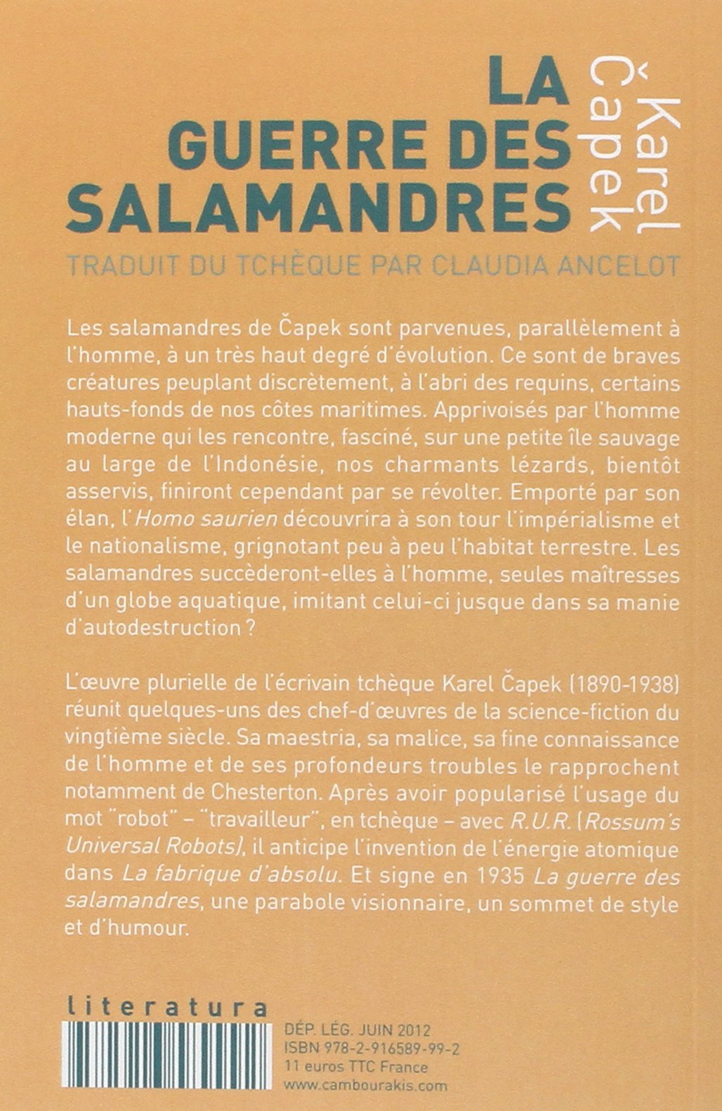 Asservies, exploitées, les salamandres finiront cependant par se révolter, initiées en cela par la pensée marxiste et sensibilisées aux droits accordés aux ouvriers. Emportées par leur élan, ces dernières découvriront alors l’impérialisme, le nationalisme, grignotant peu à peu l’habitat terrestre, nos côtes s’effondrant dans leurs océans. Succéderont-elles alors à l’homme, seules maîtresses d’un globe aquatique, imitant celui-ci jusque dans sa manie d’autodestruction ?