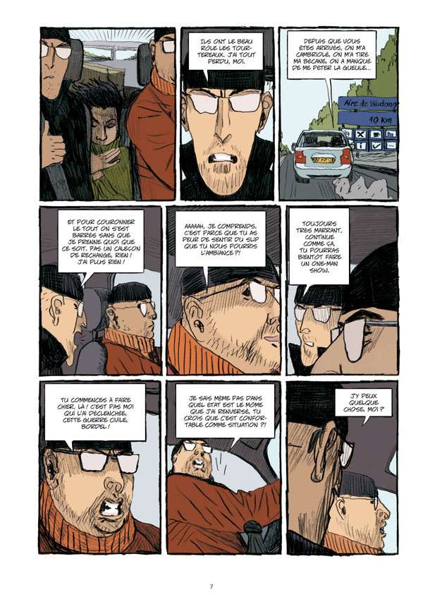 Flanqués d’un éditeur japonais, Ricard, Morvan et son amie Frédérique roulent en direction du sud de la France où ils envisagent de rejoindre Christophe Gaultier. À bord, l’ambiance est morose. Culpabilité, reproches et mauvaises plaisanteries. En quittant Paris, ils ont été forcés d’écraser un gamin qui les braquait sur la route. Une première étape dans une station-service achève de les horrifier. La guerre est partout présente