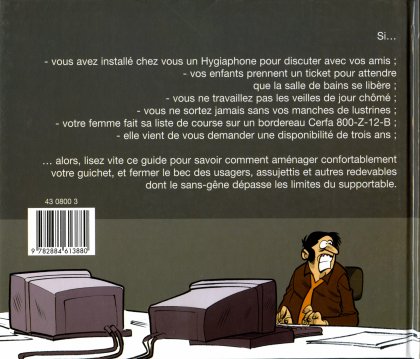 Si vous avez installé chez vous un Hygiaphone pour discuter avec vos amis ; vos enfants prennent un ticket pour attendre que la salle de bains se libère ; vous ne travaillez pas les veilles de jour chômé ; vous ne sortez jamais sans vos manches de lustrines ; votre femme fait sa liste de course sur un bordereau Cerfa 800-Z-12-B ; elle vient de vous demander une disponibilité de trois ans, alors, lisez vite ce guide pour savoir comment aménager confortablement votre guichet et fermer le bec des usagers, assujettis et autres redevables, dont le sans-gêne dépasse les limites du supportable.