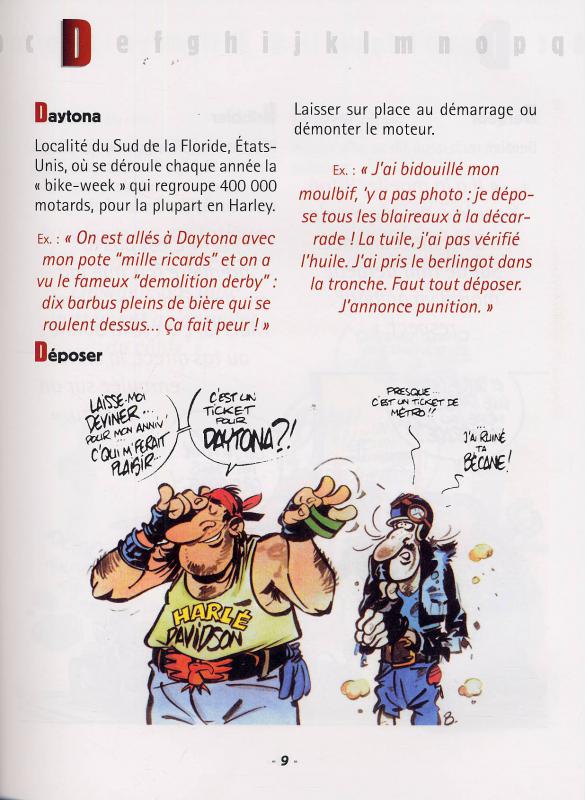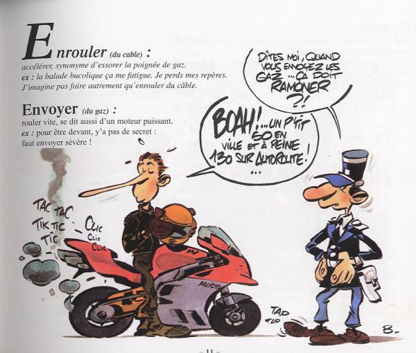 Savais-tu que l’art-goth procède parfois par créations soudaines de locutions alors que la langue courante procède par figement progressif : ainsi dans plein pot ou à fond la caisse ? Oublie, vieux, les troncations, suffixations parasitaires et autres réduplications de la langue verte. S’agit pas de faire suer le burnous. Le propos de cet ouvrage est de doter l’honnête homme d’un vocabulaire de base qui lui permette d’être entendu des motards et de les comprendre. S’agit juste de ne pas avoir l’air d’une truffe quand le premier va-de-la-gueule venu va essayer de t’embrouiller pour te fourguer son os et secouer ton blé alors que le moulbif est dans le sac. Même si t’es à l’arrêt tu pourras toujours, ami, faire briller. II en restera bien quelque chose.
