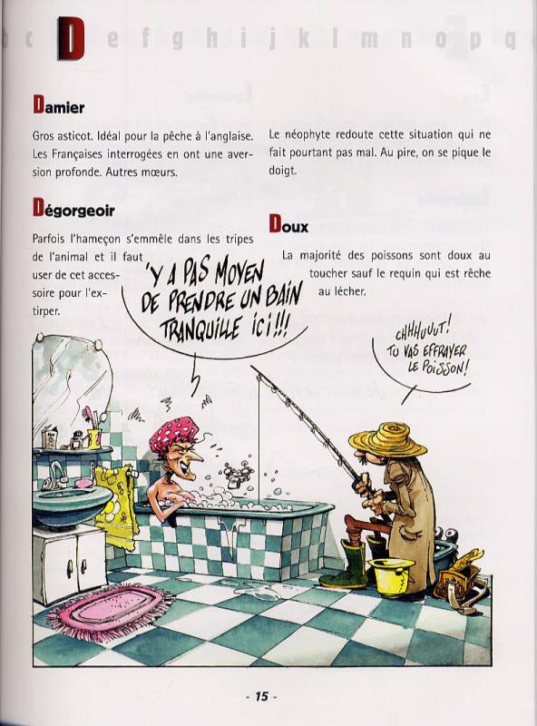 La pêche aussi a son église (Cannes), ses fervents disciples (les pécheurs écolos) et ses ennemis (les centrales nucléaires). attention à ne pas confondre le « pécheur du dimanche » avec le « véritable initié ». Le premier se suffit d’un vieux morceau de bois et d’un bout de ficelle avec, accroché à son extrémité, un asticot ridicule. Alors que notre puriste met un point d’honneur à s’équiper d’une armada d’accessoires et parle « pêcheur » couramment ! Le maître-mot reste la patience. Un véritable art de l’attente de l’être désiré : le poisson. C’est bien connu, rien de plus fatiguant que de ne rien faire. Riff et Harty l’on bien compris et, avec leur savoir-faire inimitable, ils ne sont pas contentés de se pencher sur la vie tumultueuse du pêcheur. En exclusivité, pour la première fois, ils ont également tenu compte du point de vue du poisson qui est tout de même intéressé... et qui, à force de ruses, pourrait bien prendre le pêcheur pour un thon !