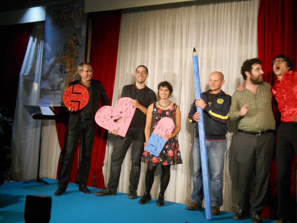 Devant un parterre d’auteurs réunis pour l’occasion, Fabien Vehlmann et Gwen de Bonneval ont procédé ce samedi 11 octobre à la traditionnelle distribution de prix du festival Quai des Bulles. Une remise de prix rythmée et "en chanté" (on a pu pour l’occasion découvrir les beaux organes de ces deux compères, nous y reviendront bientôt), au cours de laquelle Guillaume Bouzard s’est vu remettre le Prix de l’Affiche (nous vous laissons deviner quelle est la contrepartie de cette distinction) tandis que Damien Cuvillier a reçu le Prix Coup de Coeur et la charge de réaliser une carte postale pour la prochaine édition du festival.