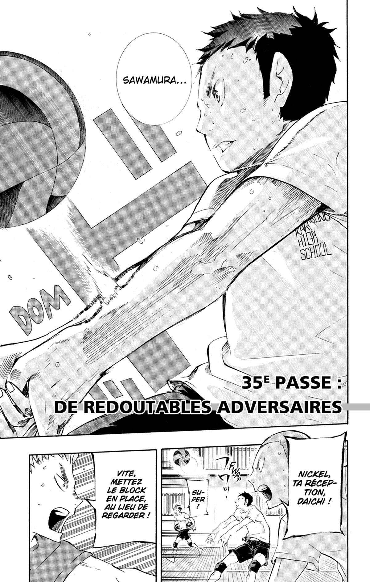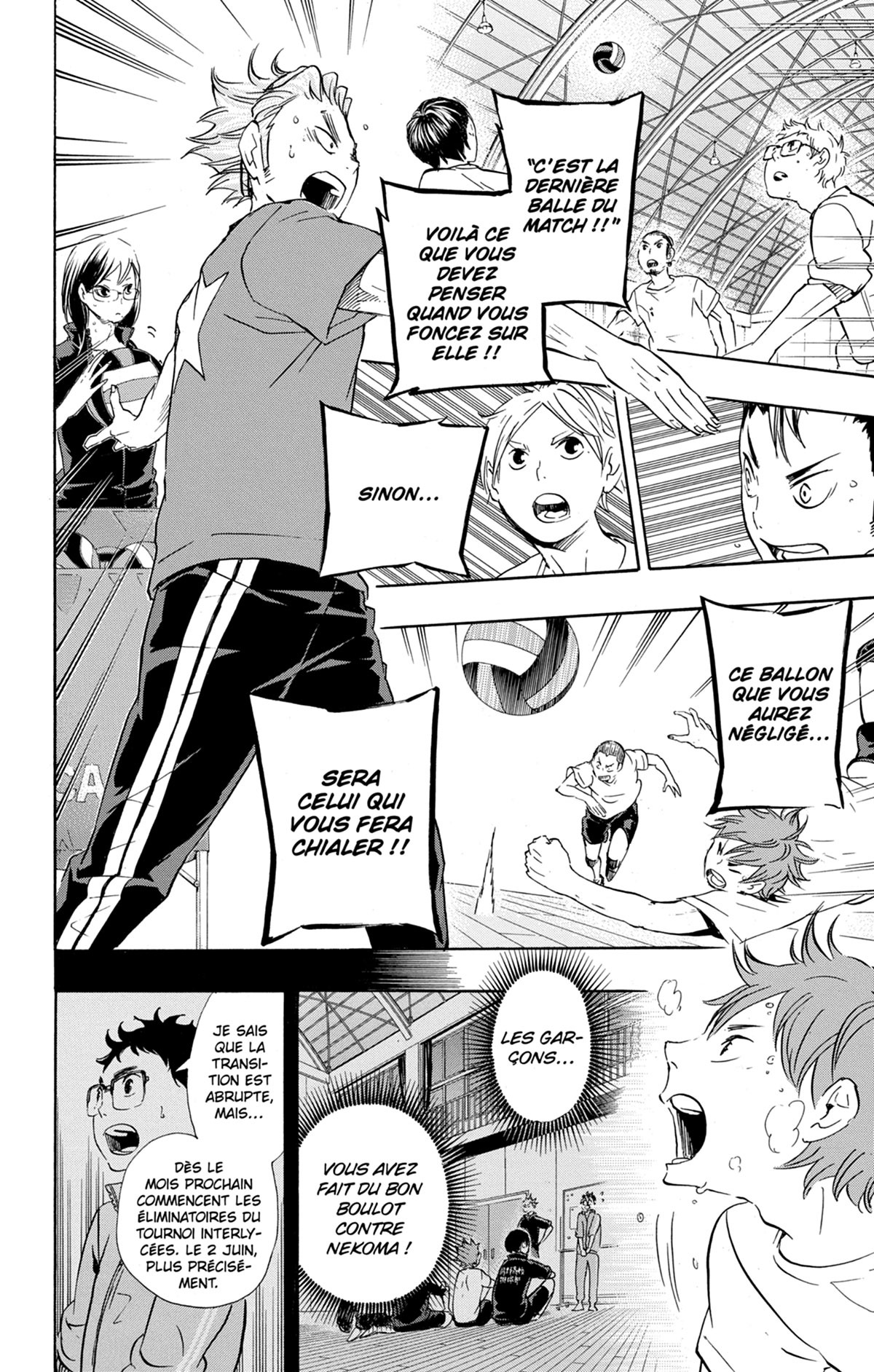 En vue des éliminatoires du tournoi Intercollèges, Hinata et ses coéquipiers redoublent d’efforts à l’entraînement ! Cependant, dans la même poule qu’eux se dressent la team bien connue d’Aoba Jôsai, et la terrible équipe Date Kôgyô, dotée de son fameux "mur d’acier" ! Mais quels que soient leurs adversaires, les corbeaux de Karasuno sont plus déterminés que jamais à atteindre le sommet !