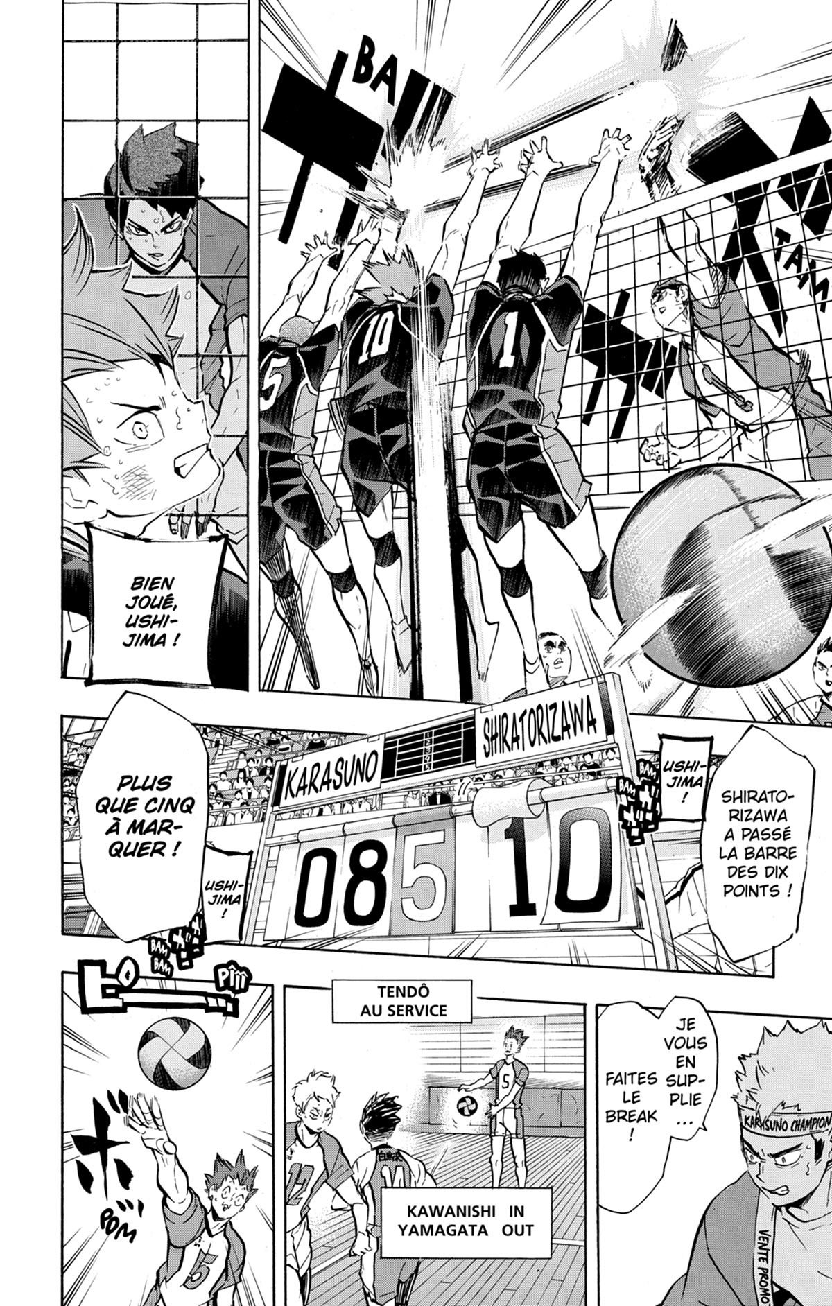 Fin du match contre Shiratorizawa dans ce cinquième et dernier set. Malgré la sortie de son pilier défensif, Tsukishima, pour cause de blessure, Karasuno ne lâche rien et grappille point après point ! Cette lutte acharnée où tous les joueurs ont déjà atteint et même dépassé leurs limites entre dans sa dernière phase. Qui se tiendra bientôt au sommet de la finale départementale ?!