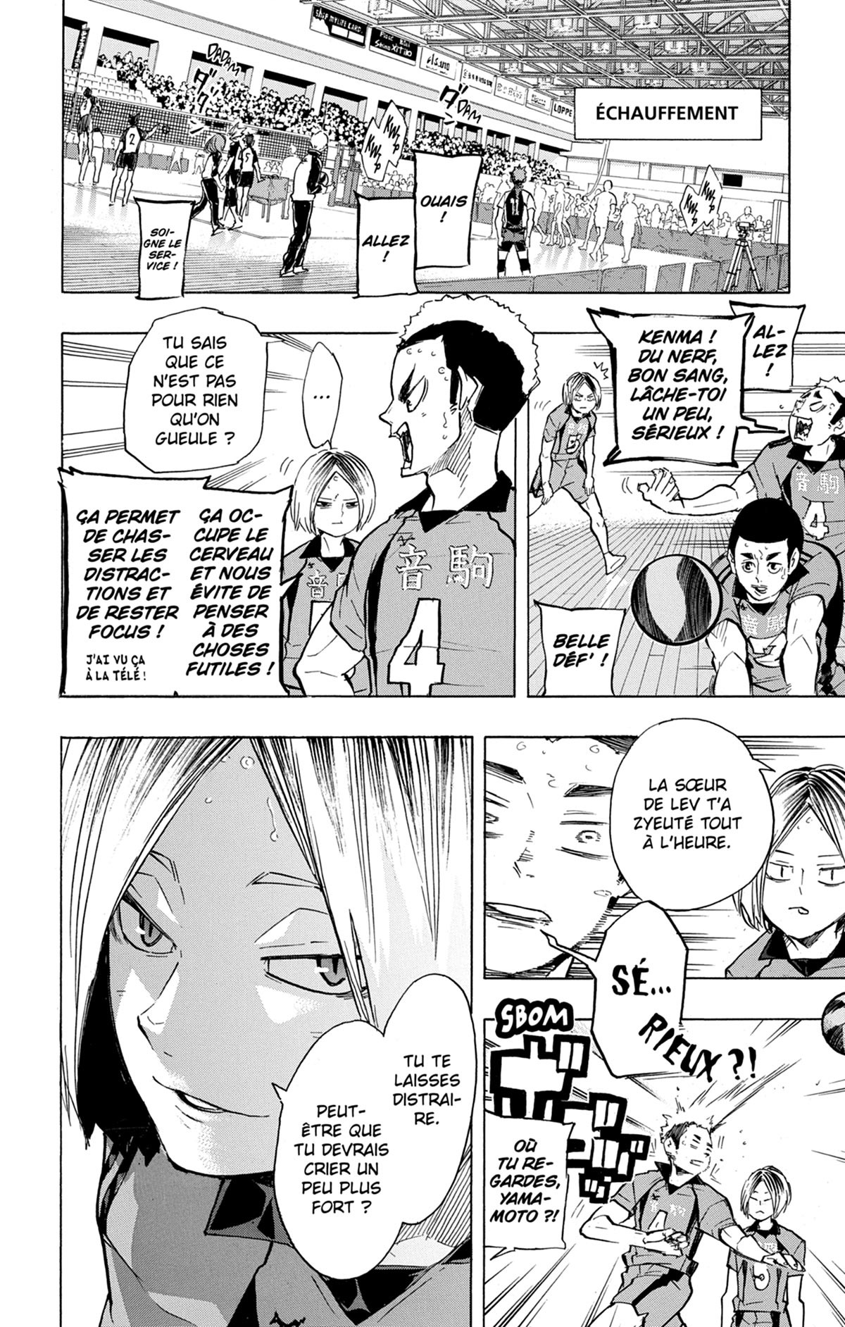 Lever de rideau sur la finale des éliminatoires du département de Tokyo pour le Printemps Interlycées ! Avec quatre équipes pour seulement trois places, la qualification peut être acquise dès le premier match qui voit s’affronter les lycées Fukurodani et Nekoma. Face à un Bokuto au meilleur de sa forme, Nekoma compte sur Yaku pour la récupération, et sur Kenma pour la stratégie ! Mais cela sera-t-il suffisant pour battre l’un des cinq meilleurs attaquants du Japon ?!