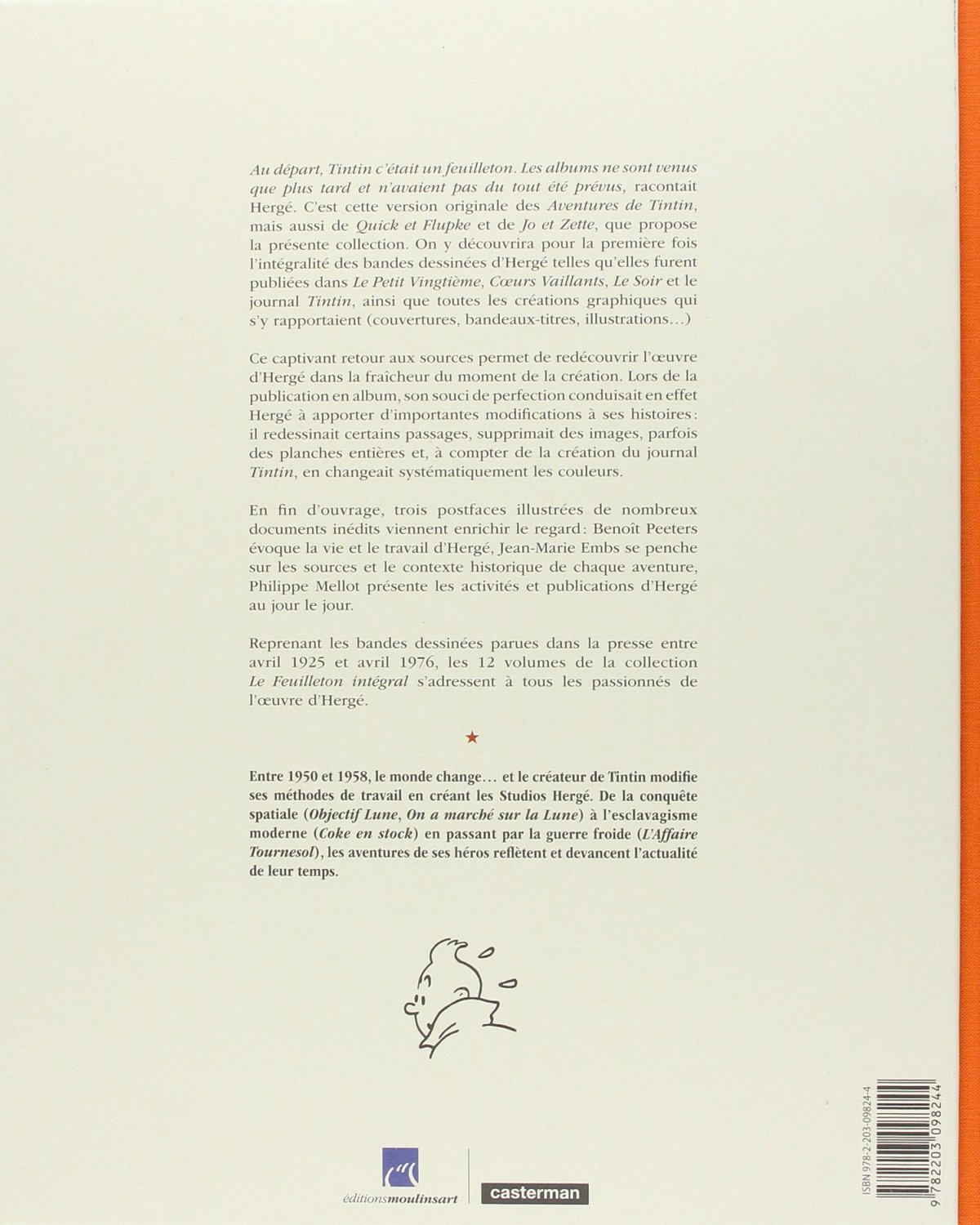 Entre 1950 et 1958, le monde change... et le créateur de Tintin modifie ses méthodes de travail en créant les Studios Hergé. De la conquête spatiale (On a marché sur la Lune, Objectif Lune) en passant la Guerre froide (L’Affaire Tournesol) ou l’esclavagisme moderne (Coke en stock), les aventures de ses héros devancent souvent l’actualité de leur temps. Hergé, Le Feuilleton Intégral est l’occasion unique de redécouvrir aujourd’hui, page à page, et dans la version originelle parue en feuilleton dans la presse, l’oeuvre d’Hergé.