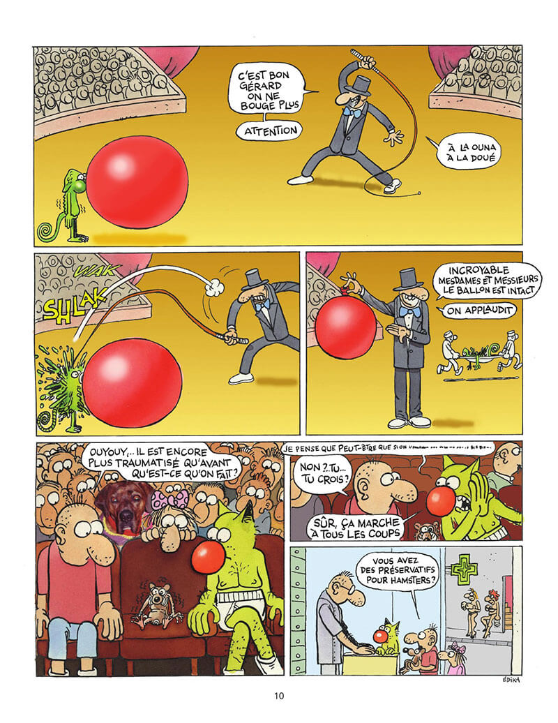 Ce qui est bien avec les albums d’Edika, c’est qu’ils sont impossibles à résumer. Dit-on d’ailleurs INrésumables ou IRrésumables ? Le temps que vous trouviez la réponse, je serai loin. Les turpitudes de la famille Proko, le client-le serveur, le banc public, des gros nichons, des baffes dans la tronche. Huit nouvelles historiettes jouissivement non-sensiques, par l’un des maîtres du gen... Attention la péniche !