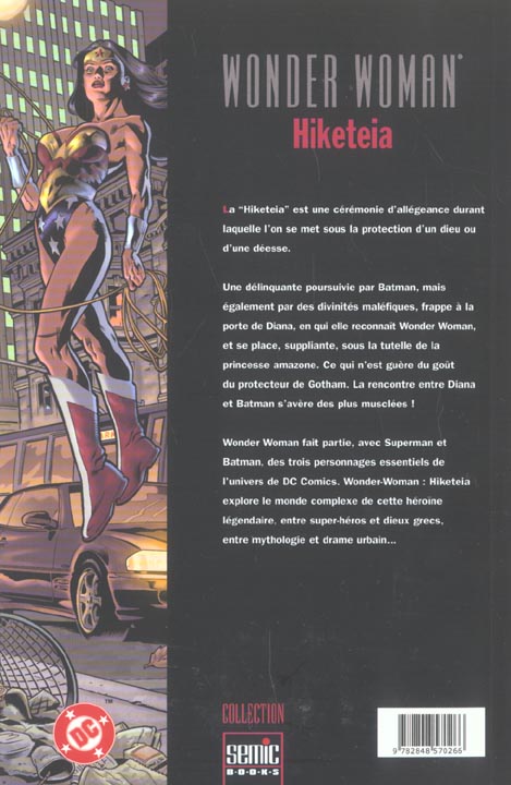 Hiketeia est une cérémonie d’allégeance durant laquelle l’on se met sous la protection d’un dieu ou d’une déesse. Une délinquante poursuivie par Batman, mais également par des divinités maléfiques. frappe à la porte de Diana, en qui elle reconnait Wonder Woman, et se place, suppliante, sous la tutelle de la princesse amazone. Ce qui n’est guère du goût du protecteur de Gotham. La rencontre entre Diana et Batman s’avère des plus musclees ! Wonder Woman fait partie. avec Superman et Batman. des trois personnages essentiels de l’univers de DC Comics. Wonder-Woman : Hiketeia explore le monde complexe de cette héroïne légendaire, entre super-héros et dieux grecs. entre mythologie et drame urbain...