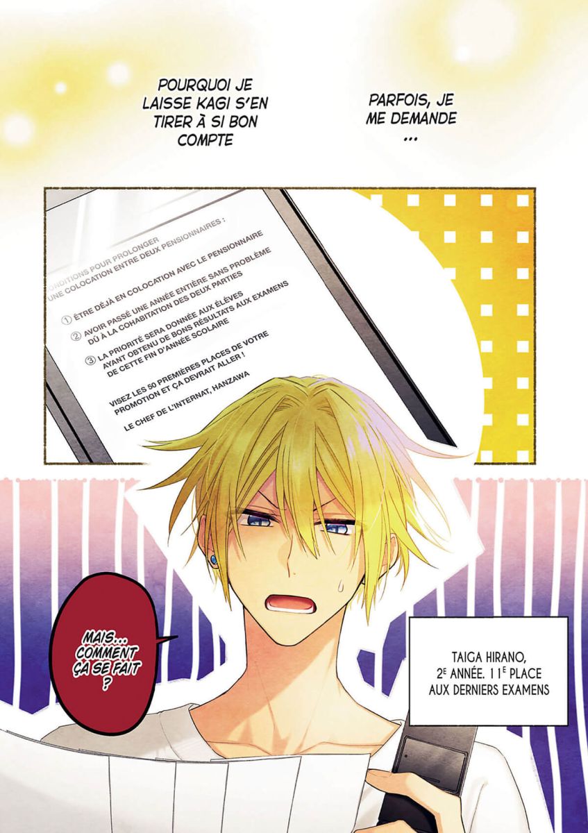 Alors que Kagiura appréhendait un quotidien à l’internat loin de l’élu de son coeur, les deux colocataires apprennent qu’à condition d’obtenir de bons résultats lors des prochains examens, ils pourront continuer à partager leur chambre l’année prochaine ! Voir Kagiura redoubler d’efforts pour rester à ses côtés pourrait bien éveiller de nouveaux sentiments dans le coeur de Hirano...