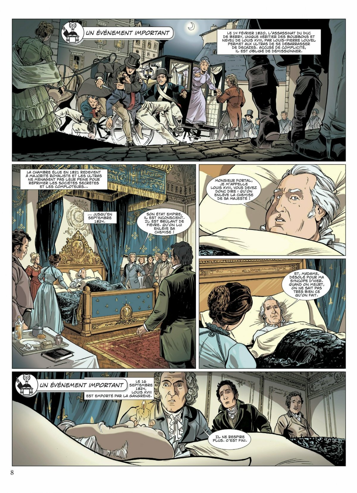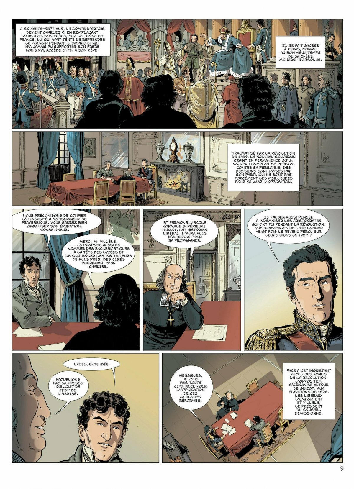 1815. Fini le Grand Empire ! Bonjour la Restauration...de la royauté avec Louis XVIII, le frère de Louis XVI. L’influence des royalistes se renforce en 1824 avec Charles X qui refuse toute réforme. Le peuple souffre et se révolte les 27, 28 et 29 juillet 1830 - les Trois Glorieuses. Avec Louis-Philippe, la France est prospère. Sauf pour le peuple... Nouvelle Révolution en 1848 ! IIe République ! Son président devient en 1852 l’empereur Napoléon III qui modernise le pays mais... les Prussiens l’attaquent, le vainquent. Napoléon III ? Il est fait prisonnier à Sedan le 2 septembre 1870. Deux jours plus tard, la IIIe République est proclamée. L’année suivante, la Commune de Paris subit une terrible répression. De 1894 à 1906, l’affaire Dreyfus déchaîne un antisémitisme redoutable. Le début du XXe siècle est appelé la Belle époque. Juste avant la guerre atroce...