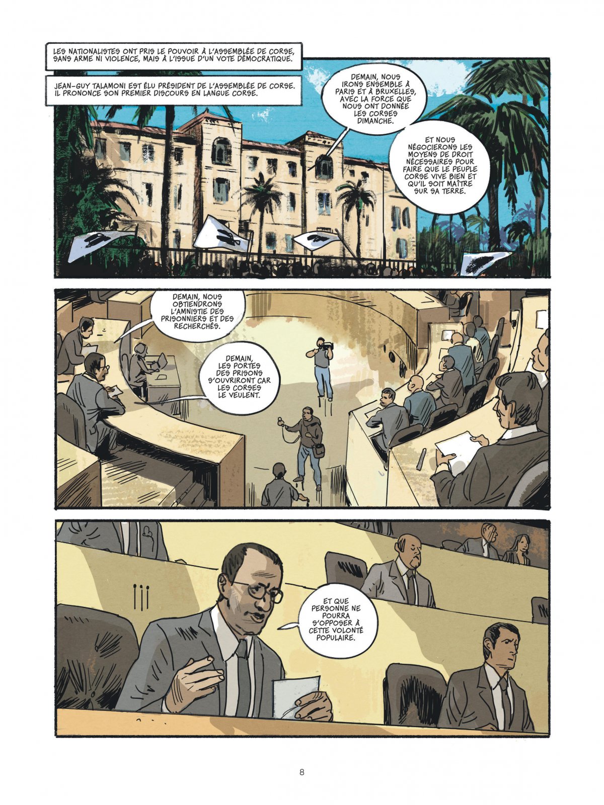 Sous le trait efficace de Benjamin Adès, la journaliste Hélène Constanty revient sur ces événements et raconte, sous forme d’un véritable documentaire, les principales étapes qui ont abouti à cette situation - dont l’assassinat du préfet Erignac en 1998 - sur fond de règlements de comptes et de dérives parfois mafieuses d’un mouvement incontrôlable et lui-même divisé, le FLNC.