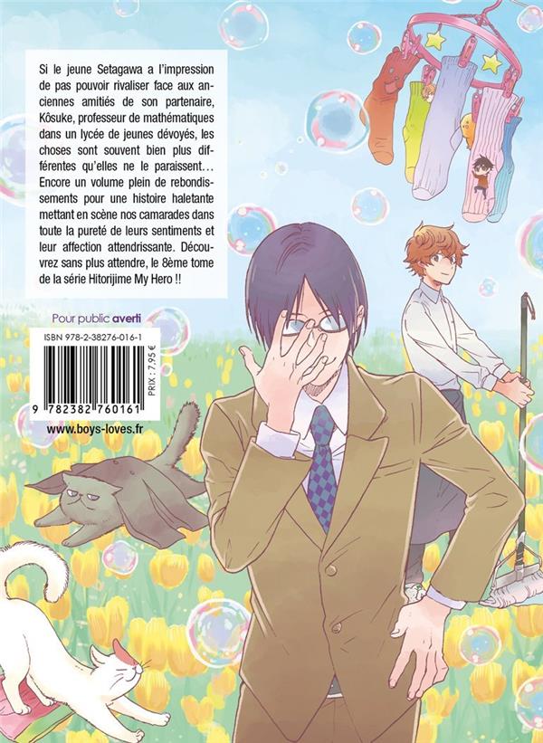 Si le jeune Setagawa a l’impression de pas pouvoir rivaliser face aux anciennes amitiés de son partenaire, Kôsuke, professeur de mathématiques dans un lycée de jeunes dévoyés, les choses sont souvent bien plus différentes qu’elles ne le paraissent... Encore un volume plein de rebondissements pour une histoire haletante mettant en scène nos camarades dans toute la pureté de leurs sentiments et leur affection attendrissante. Découvrez sans plus attendre, le 8ème tome de la série Hitorijime My Hero !!