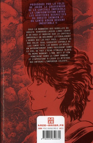 Provoquée par la folie de Jakoh, le gouverneur de la capitale impériale, la confrontation entre les héritiers respectifs du Hokuto Shinken et du Gento Kôken devient inévitable !! Sous la bannière des rebelles du Hokuto, Kenshirô laisse libre cours à sa rage et marche sur la capitale impériale en décimant littéralement l’armée qui lui fait face... jusqu’à ce que Falco, seul guerrier capable de lui tenir tête, lui barre la route. Un affrontement sans précédent dont le ciel se fait l’écho s’engage alors. Au même moment, Lynn, Batt et Ein pénètrent dans le camp ennemi et s’apprêtent à lever le mystère qui entoure l’Empereur Céleste...