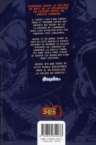 Après avoir éliminé la menace que représentait l’armée de Golan, Kenshirô prend le chemin du village natal de Batt pour y raccompagner Taki, enfant égaré dans le désert à la recherche d’une âme charitable susceptible d’aider les siens. Arrivés sur place, ils découvrent qu’une vieille femme est seule pour protéger la ville devenue un refuge pour les orphelins. Souffrant depuis longtemps de la pénurie d’eau, Taki décide d’aller en dérober dans un puits voisin, gardé par une bande de brutes sanguinaires dirigée par le cruel Jackal... Et Taki est assassiné sans ménagement... Ne pouvant laisser ce crime gratuit impuni, Kenshirô élimine l’un des chacals et sauve le village de la sécheresse en faisant appel au Hokuto Shinken. Il libère l’eau d’une source tarie et redonne espoir aux enfants qui voient en lui le sauveur de l’humanité. Mais leur situation n’est pas radieuse très longtemps... Jackal et sa bande, ayant eu vent de cette nouvelle source, décident de prendre le village d’assaut en l’absence de Kenshirô. La vieille femme est donc seule pour tenter de sauver les orphelins d’une mort certaine... Jackal n’a que faire de cette faible résistance mais va réveiller la colère du Hokuto !