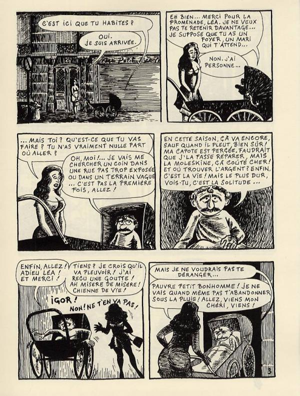 Après s’être taillé, au début des années 70, un beau succès en tant que scénariste, Jacques Lob revient au dessin avec L’Homme au landau, publié dans L’Echo des savanes de 1975 à 1977.Un musicien des rues chante la complainte de « l’homme enfant qui n’a pas de cœur » et met en garde : "Comme une méduse sur son radeau / Femmes, attention, voici / L’homme au landau... "Si Lob semble parodier la littérature populaire, comme dans les aventures de Blanche-Epiphanie, l’infortunée et pulpeuse orpheline imaginée en 1967, le ton devient vite plus sombre et grinçant.Installé dans son landau comme un escargot dans sa coquille, ce séducteur frustrant et frustré, infantile et moustachu, apitoie les femmes en pleurnichant sur sa solitude et sa faiblesse.Ce roué cynique, qui a les traits de Lob, joue de la fibre maternelle pour s’insinuer et s’imposer. Une fois en place, le ton change : il fume, pisse dans le lavabo et met en scène quelques pauvres fantasmes tirés du bric-à-brac de l’adolescence : westerns, trains électriques, revues coquines. L’humble ouvrière, entre Gina Lollobrigida et Betty Page, finit exploitée, comme il se doit, et sexuellement, et économiquement. Et Lob décrit la relation homme-femme dans le cadre de la dialectique du maître et de l’esclave. Mais la jouissance du maître n’est qu’une fuite devant la vie. Pour l’homme-enfant, qui garde avec lui une photo de sa mère en porte-jarretelles et bas noirs, l’existence se ramène à un éternel ricanement, stérile et sans joie.