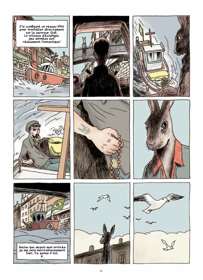 K. est un homme à tête de lapin. Concepteur d’un logiciel innovant de réalité augmentée, il est chargé de déployer son programme en Lointaine Province. Cette simple formalité se transforme en épreuve de force lorsque, gagné par la fatigue, il assiste impuissant à la déliquescence de son travail. Physiquement atteint et moralement perturbé, K. trouve réconfort dans une curieuse ruelle abandonnée du quartier haut de la ville