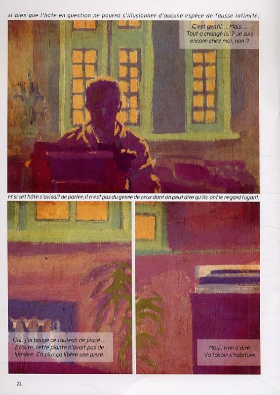 Le livre est traversé par un texte enigmatique qui semble décrire la vie et la personnalité de Jan. Il est réparti en deux lignes par planche. Chacune de ces lignes font une centaines de caractères et déroule en fait une seule et même phrase qui n’a ni début ni fin. La mise en scène de la trame visuelle (les images donc) reste très sobre et l’intrigue assez ténue, de la même façon que la trame littéraire n’est pratiquement pas narrative (plutôt même contemplative), de façon à ce que ces deux trames parallèles ne se télescopent pas trop dans l’esprit du lecteur et que la lecture ne deviennent pas un exercice inutilement fastidieux. Ces deux trames se croisent (nécessairement puisqu’il y est question de Jan et de son appartement), mais conservent toujours un décalage insolite.